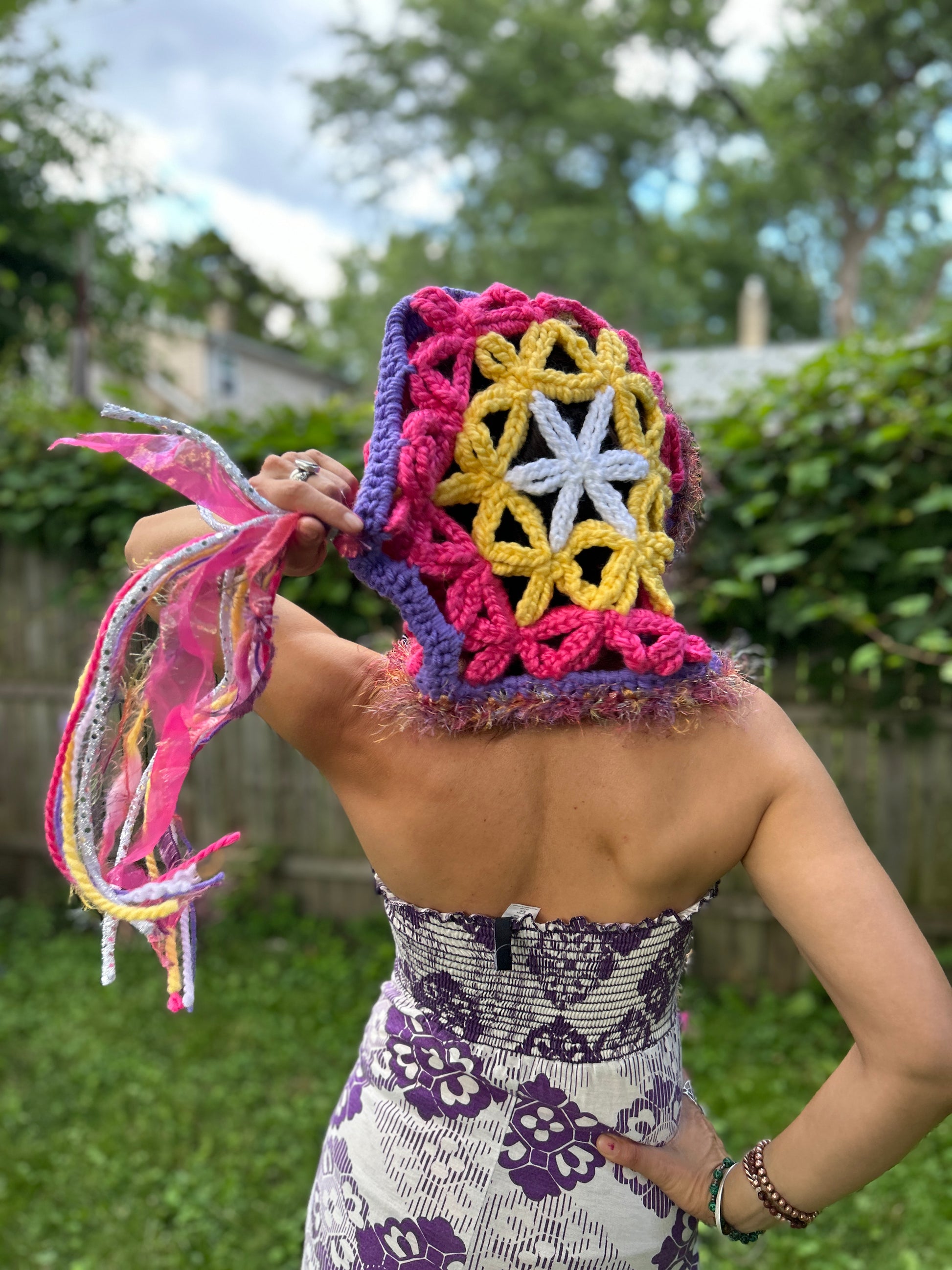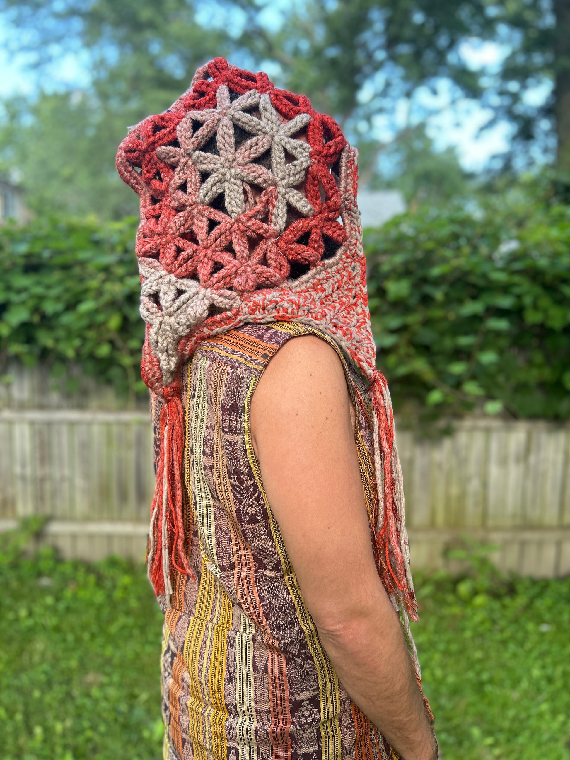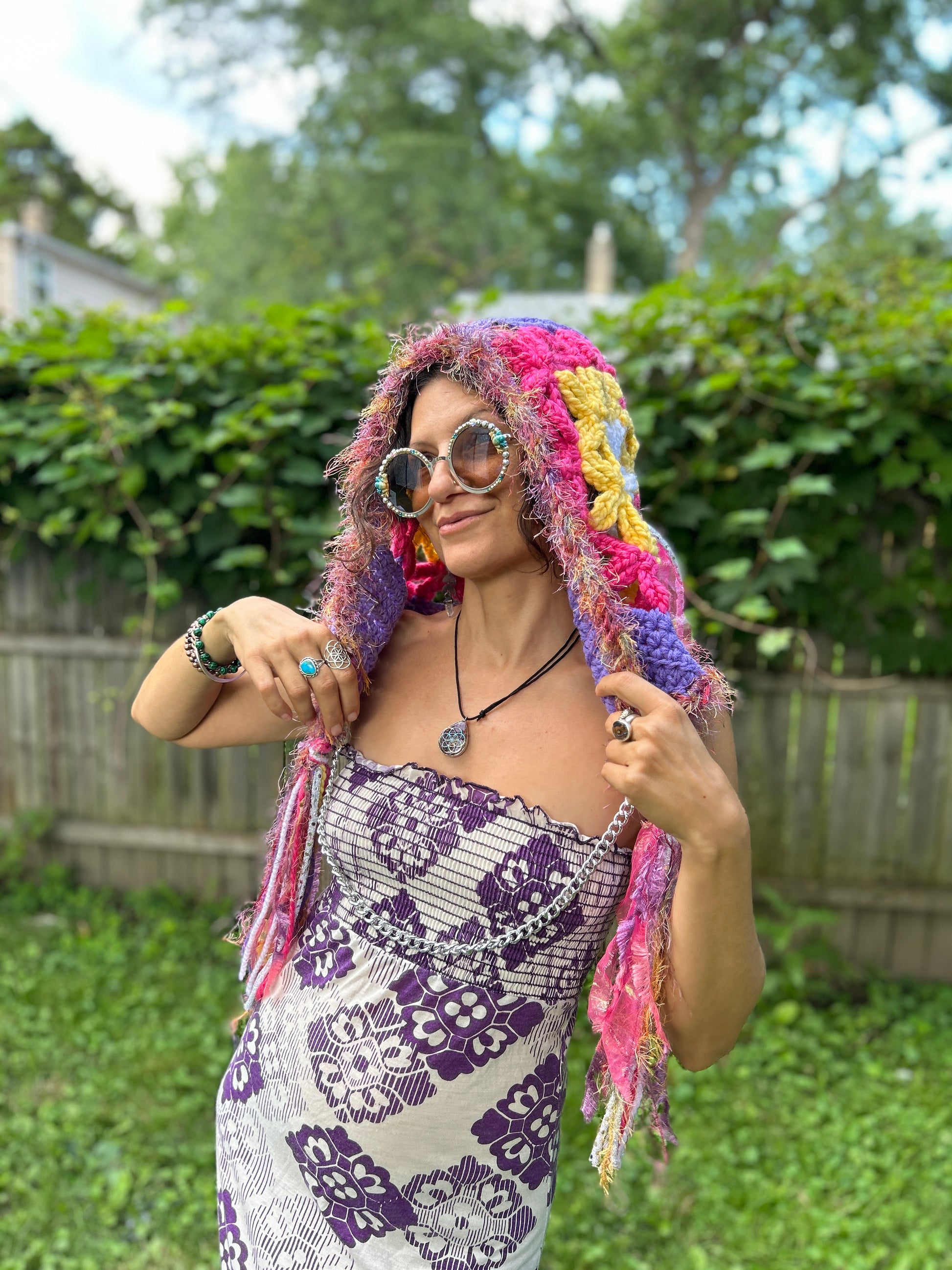 This Flower of Life hood is a mix of really fun colors, it has silver metallic accent fabric on the tassels and a silver chain embellishment. Made of acrylic blend yarn and a variety of novelty /faux fur yarn for the trim. I have a couple other hoods available on the site if you want to see a few more options that are currently available! This hood fits all sizes as it has a pretty forgiving loose fit :)