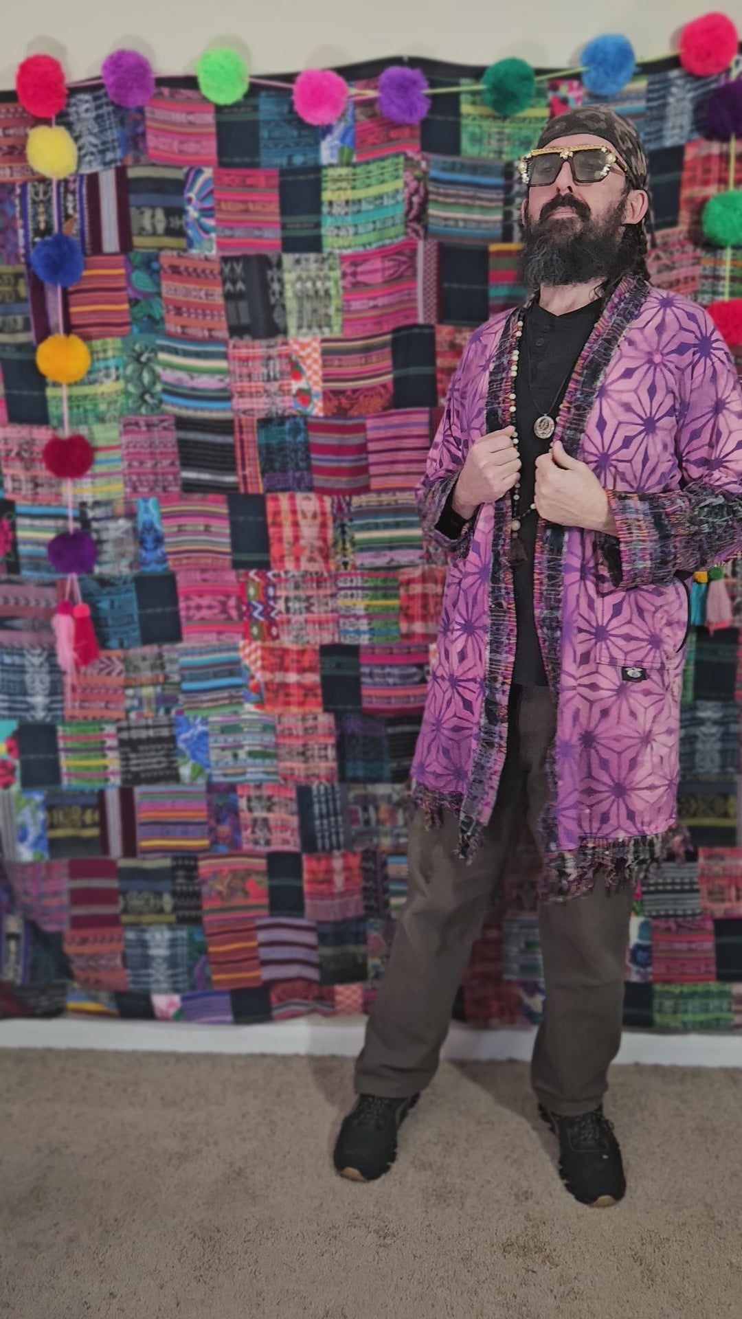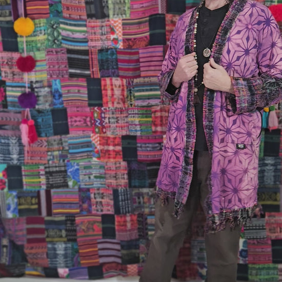Funk up Your Vibe & Liberate Your Fashion with this super heady one of a kind collab kimono by Moksha Moda & Jenzified Designz. The kimono is ethically crafted with beautiful upcycled hand woven Mayan fabrics from Guatemala for the detail and super soft breathable jersey that is then shipped to Jenzified Designz in Maine for her to hand bleach stencil. This one of a kind unisex kimono also features a removable belt and four pockets, two of which are zippers.