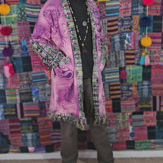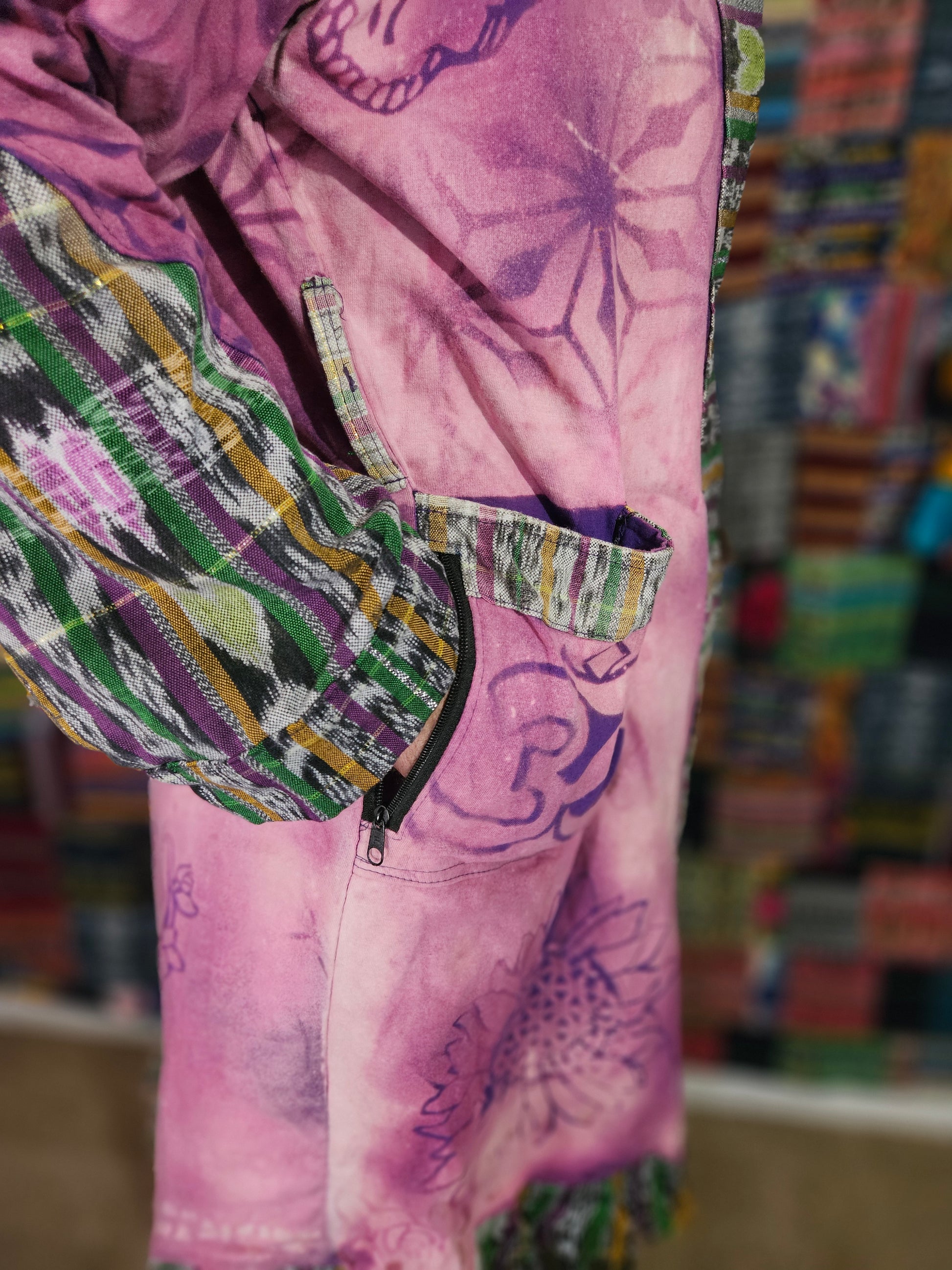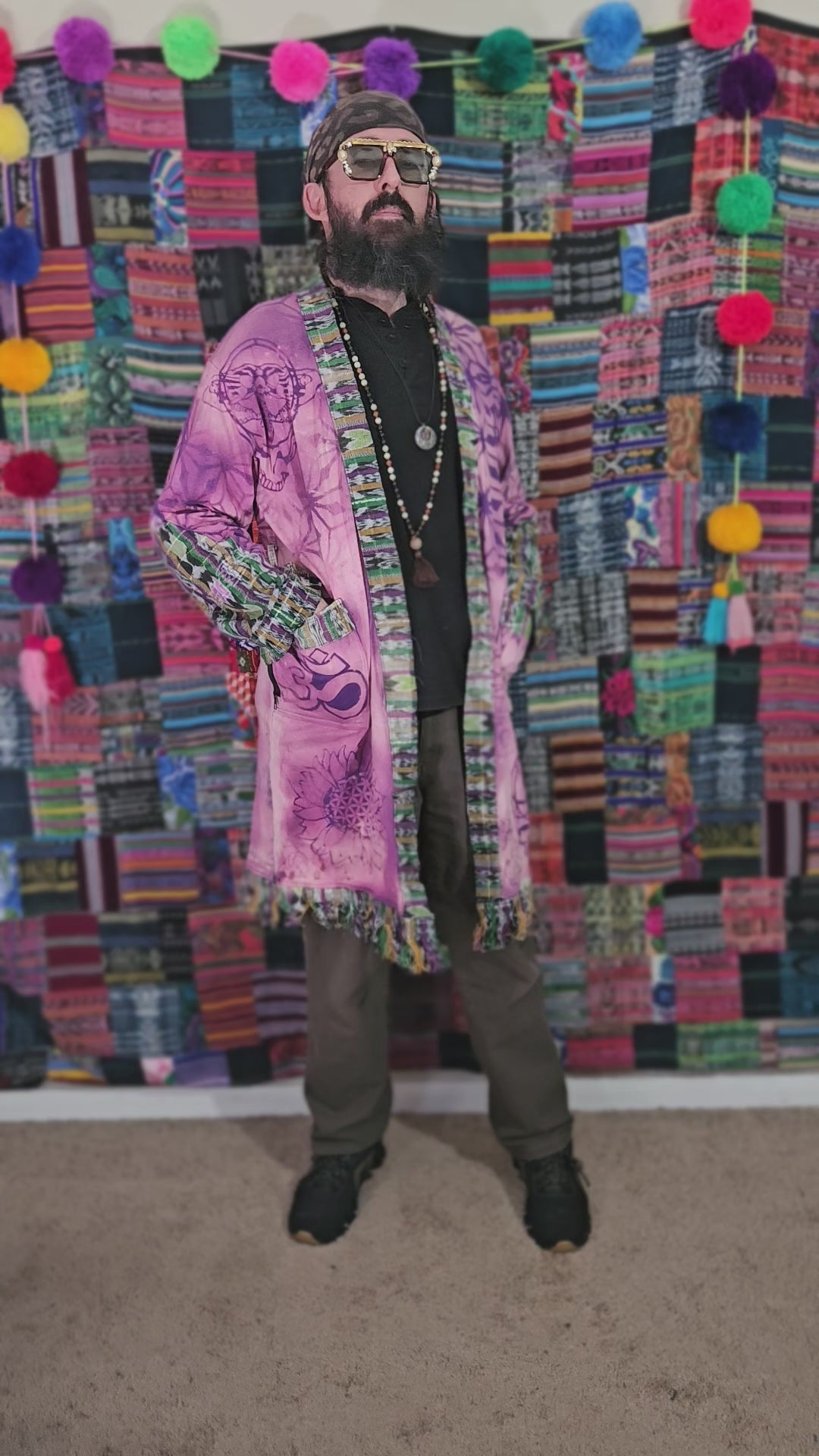 Funk up Your Vibe & Liberate Your Fashion with this super heady one of a kind collab kimono by Moksha Moda & Jenzified Designz. The kimono is ethically crafted with beautiful upcycled hand woven Mayan fabrics from Guatemala for the detail and super soft breathable jersey that is then shipped to Jenzified Designz in Maine for her to hand bleach stencil. This one of a kind unisex kimono also features a removable belt and four pockets, two of which are zippers.