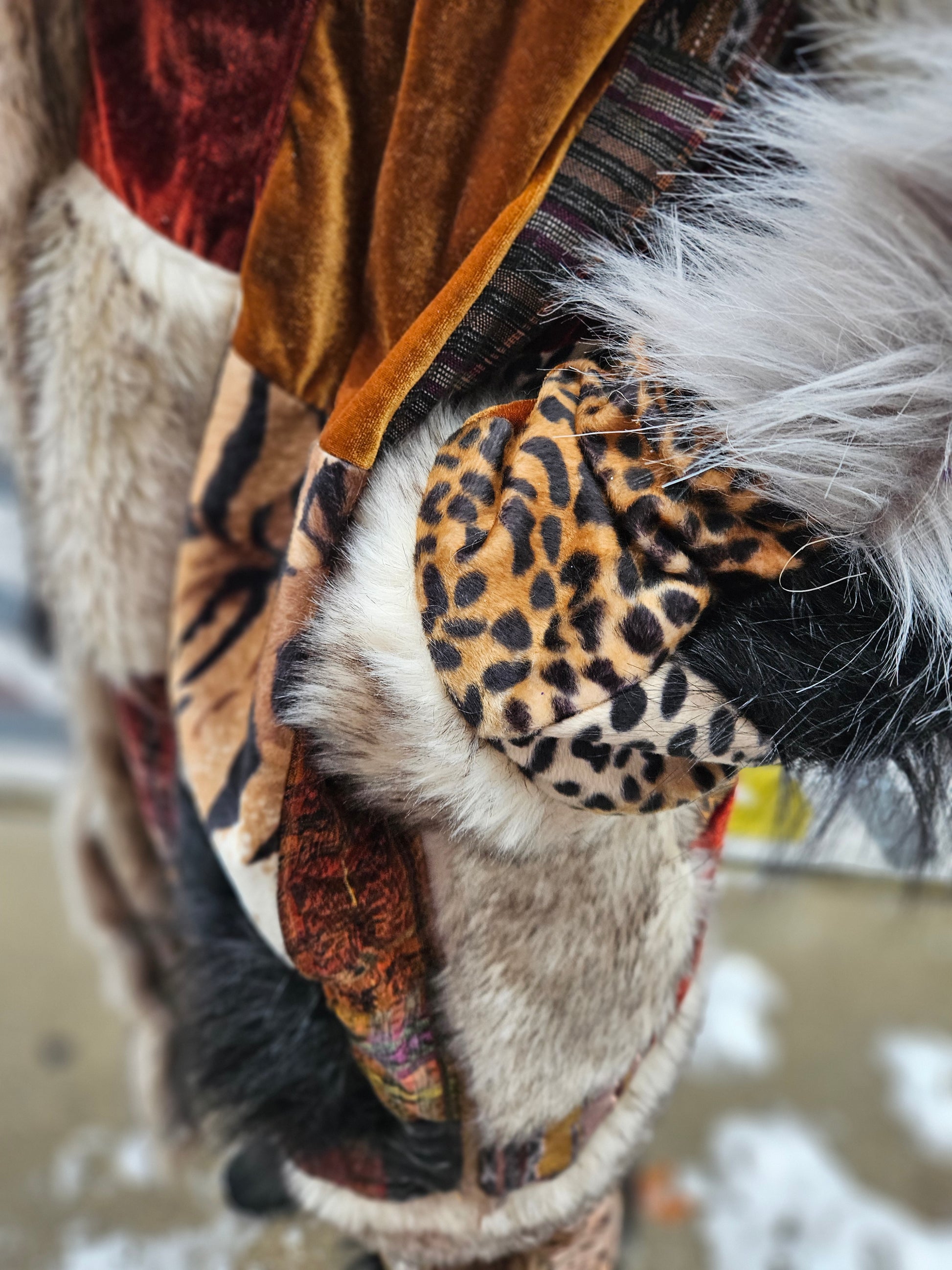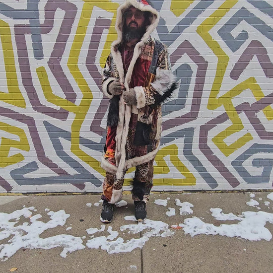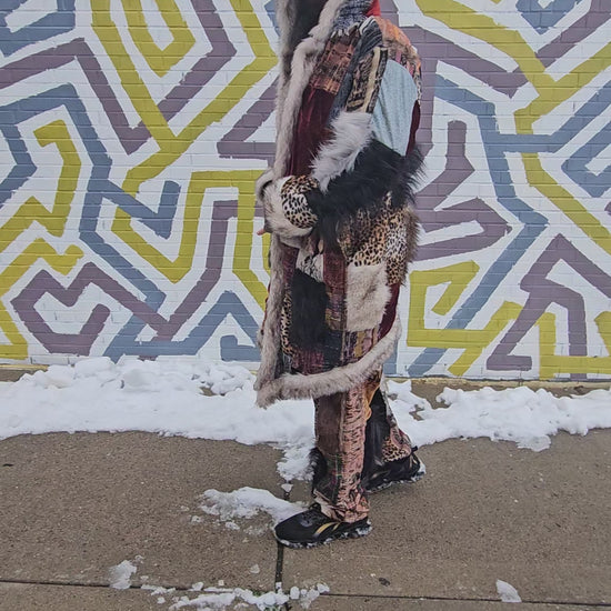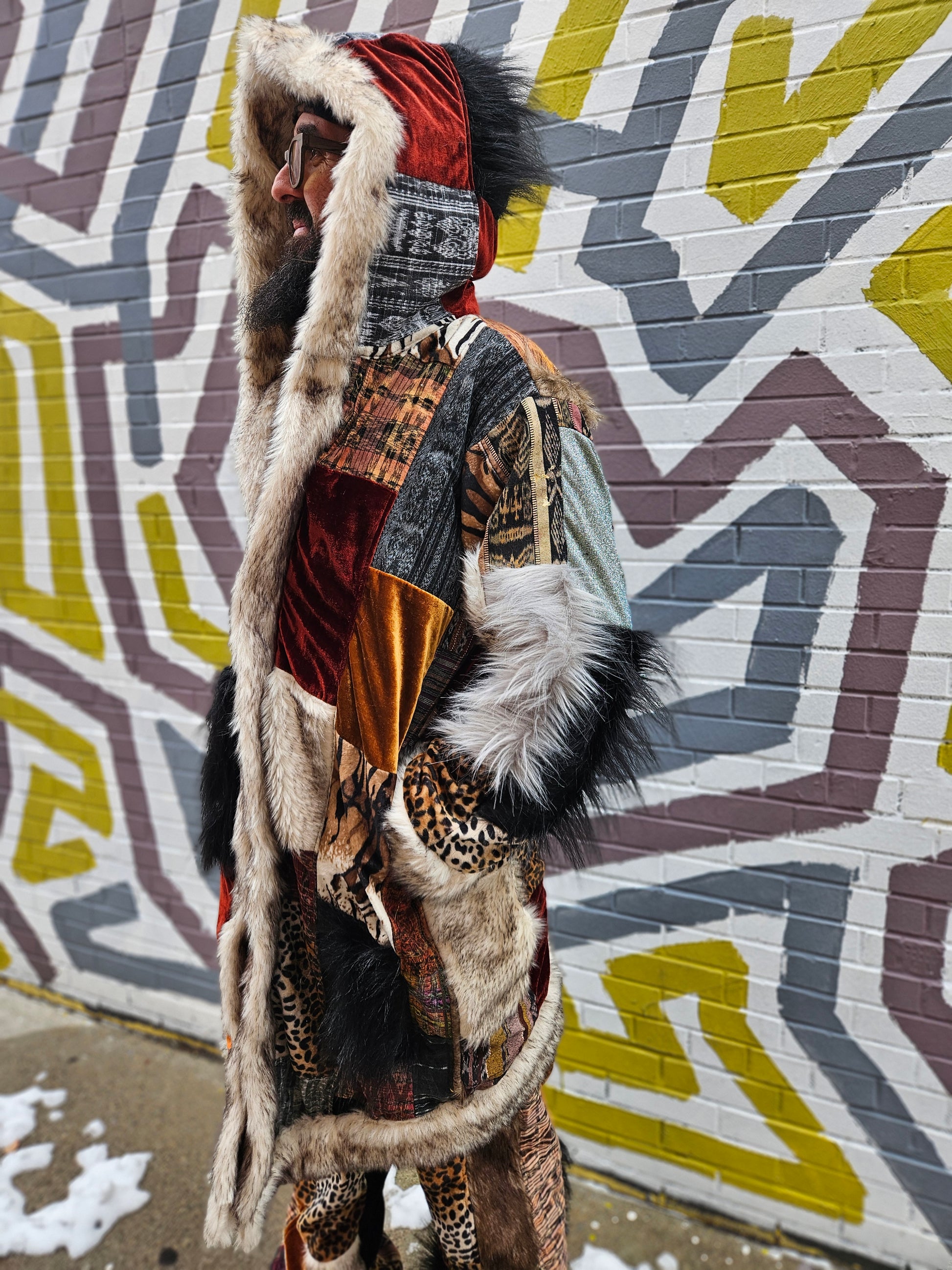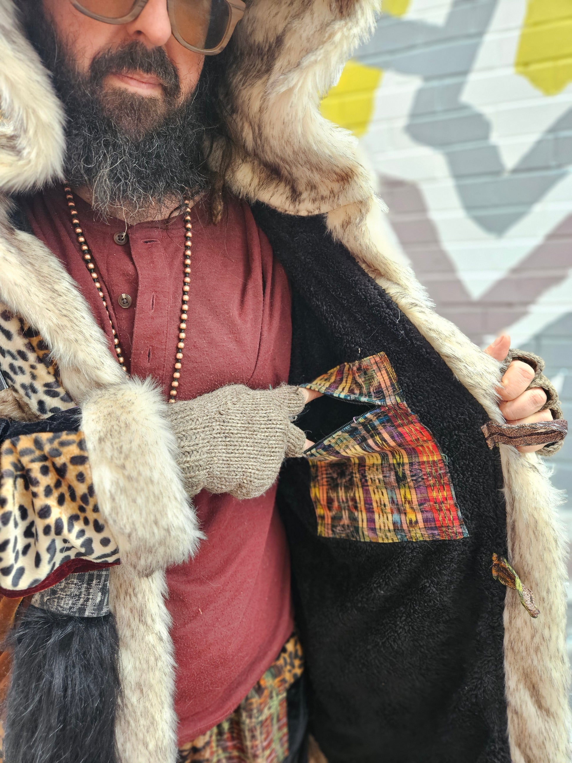 Liberate your journey and Funk up your Vibe with the latest Patchwork Cloak by Moksha Moda. This one-of-a-kind wearable work of art is ethically crafted in Guatemala with the scraps of the different collections that have been crafted over the past few years by the team of Moksha Moda. Textiles included in this patchwork cloak are beautiful upcycled fabrics from traditional hand-woven Mayan skirts sourced from second-hand markets in Guatemala, wild polyester prints, luxurious faux fur, and elegant velvet. The cloak includes three pockets, is fleece lined, two front coconut buttons, and has a wild faux fur hood.