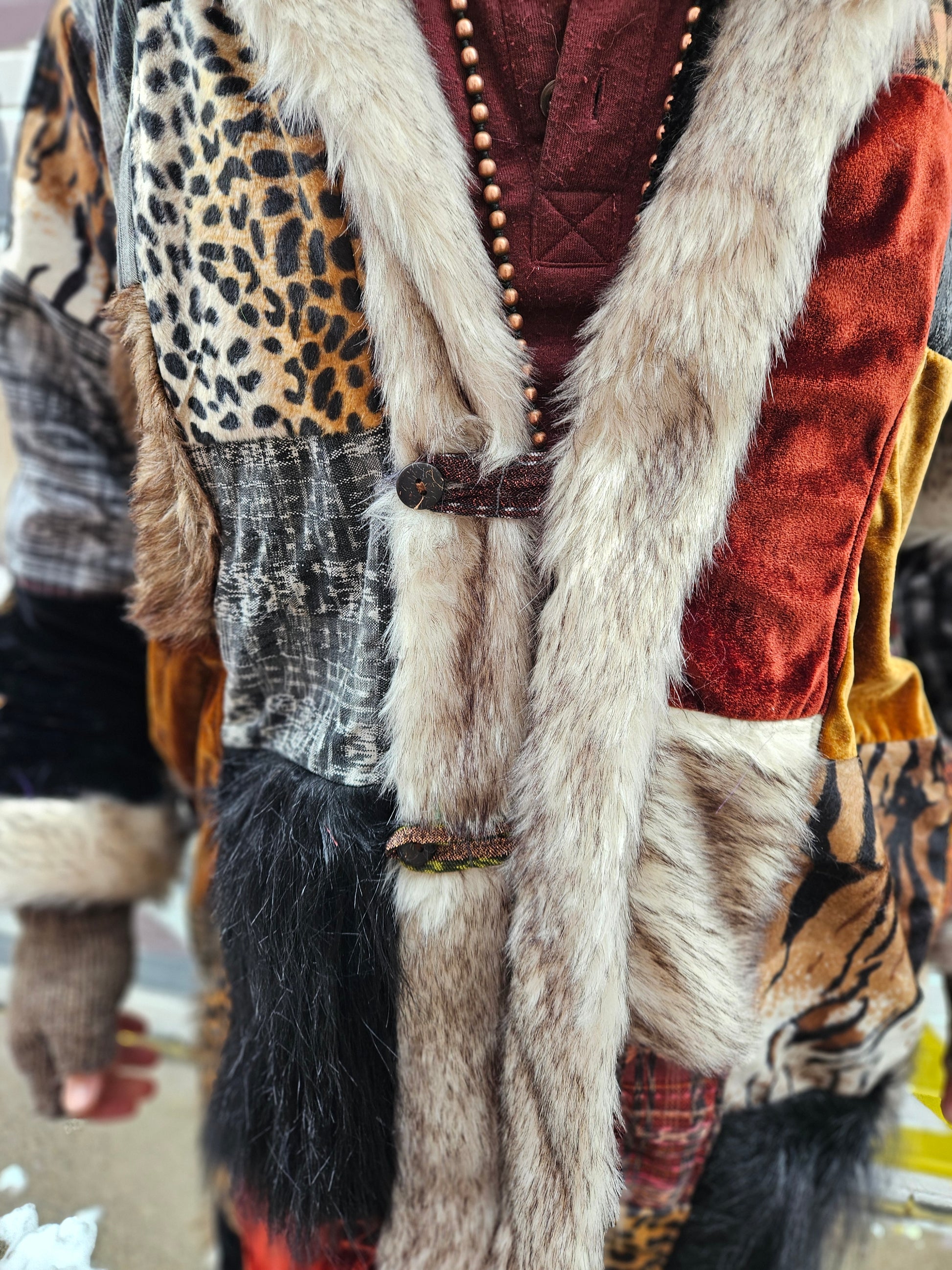 Each Moksha Moda patchwork cloak is a one-of-a-kind wearable work of art. With its unique blend of ethical craftsmanship, upcycled materials, and funky style, this patchwork cloak is sure to Funk Up Your Vibe, Liberate your Fashion, and it is ready for an adventure of a lifetime.
