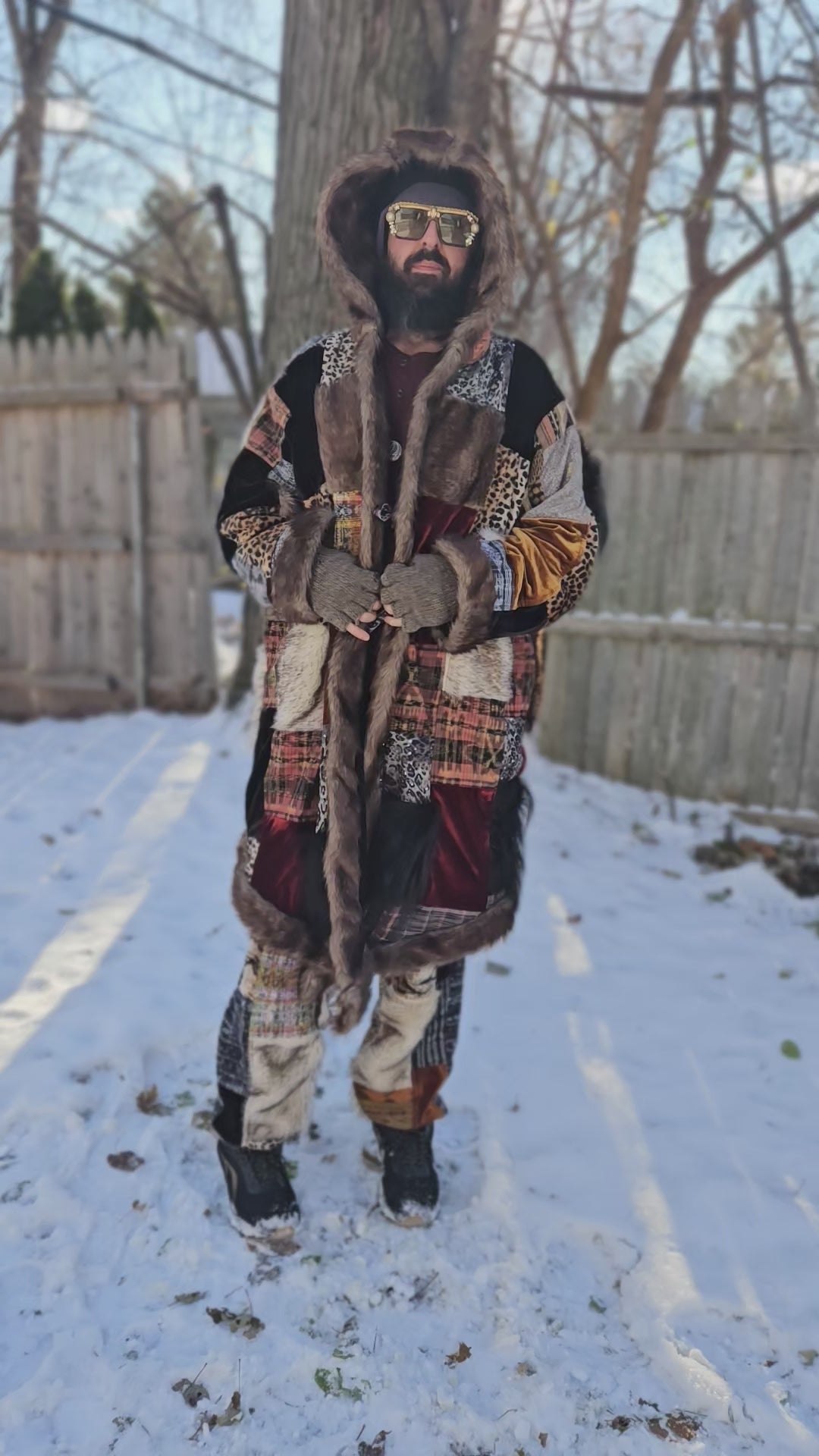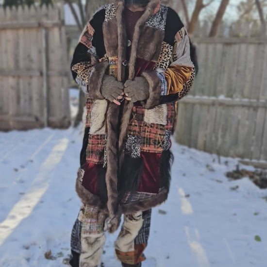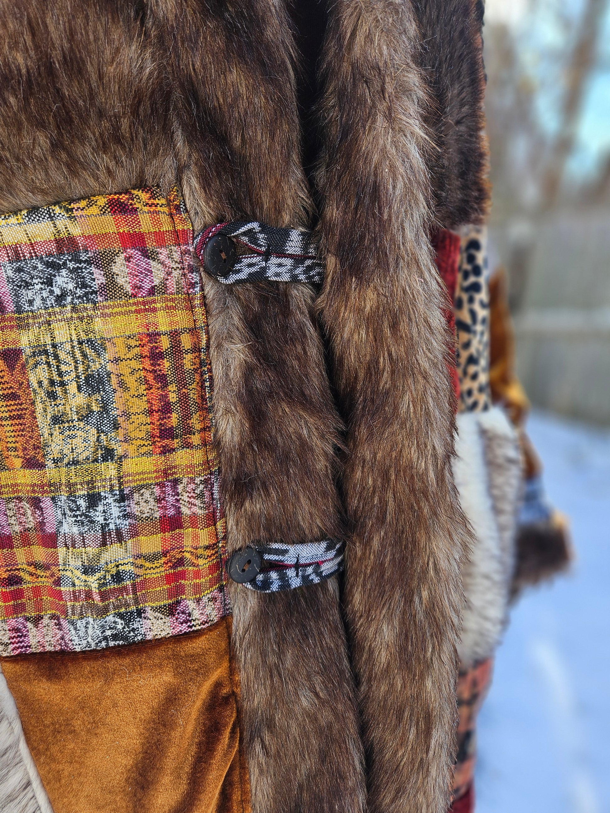 Liberate your journey and Funk up your Vibe with the latest Patchwork Cloak by Moksha Moda. This one-of-a-kind wearable work of art is ethically crafted in Guatemala with the scraps of the different collections that have been crafted over the past few years by the team of Moksha Moda. Textiles included in this patchwork cloak are beautiful upcycled fabrics from traditional hand-woven cotton Mayan skirts sourced from second-hand markets in Guatemala, wild polyester prints, luxurious faux fur, and elegant velvet. The cloak includes three pockets including an inside zipper pocket, is fleece lined, two front coconut buttons, and has a wild faux fur hood.