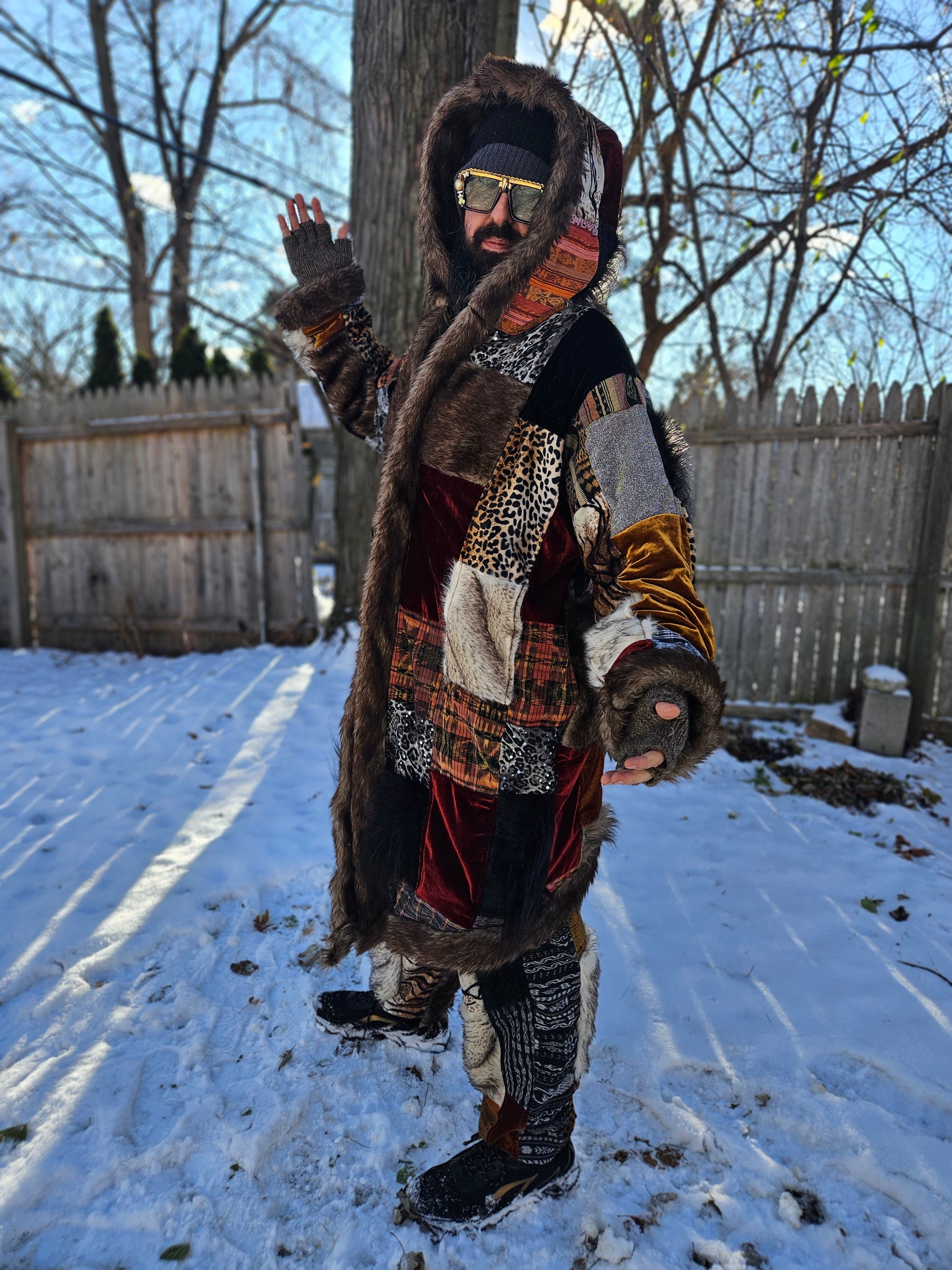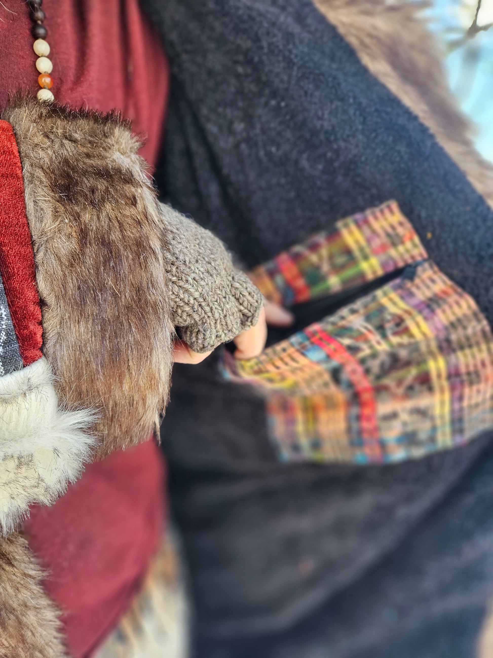 Each Moksha Moda patchwork cloak is a one-of-a-kind wearable work of art. With its unique blend of ethical craftsmanship, upcycled materials, and funky style, this patchwork cloak is sure to Funk Up Your Vibe, Liberate your Fashion, and it is ready for an adventure of a lifetime.