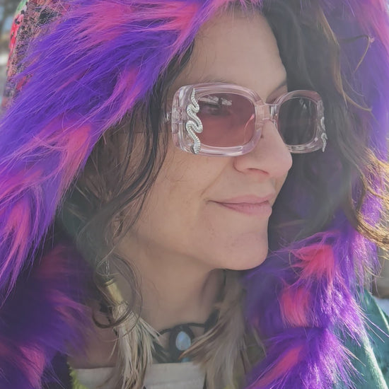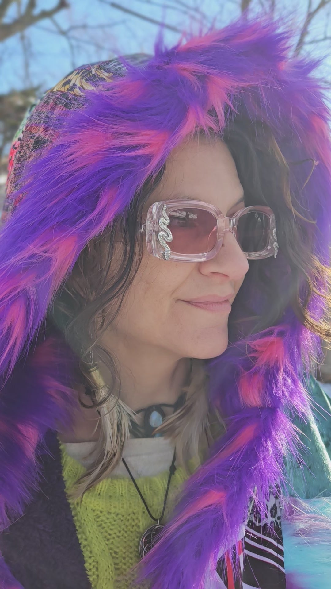 Liberate your journey and Funk up your Vibe with the latest Patchwork Cloak by Moksha Moda. This one-of-a-kind wearable work of art is ethically crafted in Guatemala with the scraps of the different collections that have been crafted over the past few years by the team of Moksha Moda. Textiles included in this patchwork cloak are beautiful upcycled fabrics from traditional hand-woven cotton Mayan skirts sourced from second-hand markets in Guatemala, wild polyester prints, luxurious faux fur, and elegant velvet. The cloak includes three pockets including an inside zipper pocket, is fleece lined, two front coconut buttons, and has a wild faux fur hood.