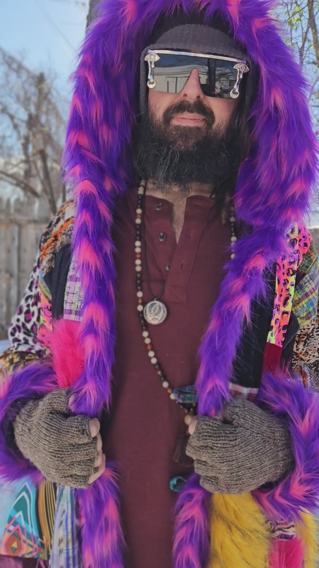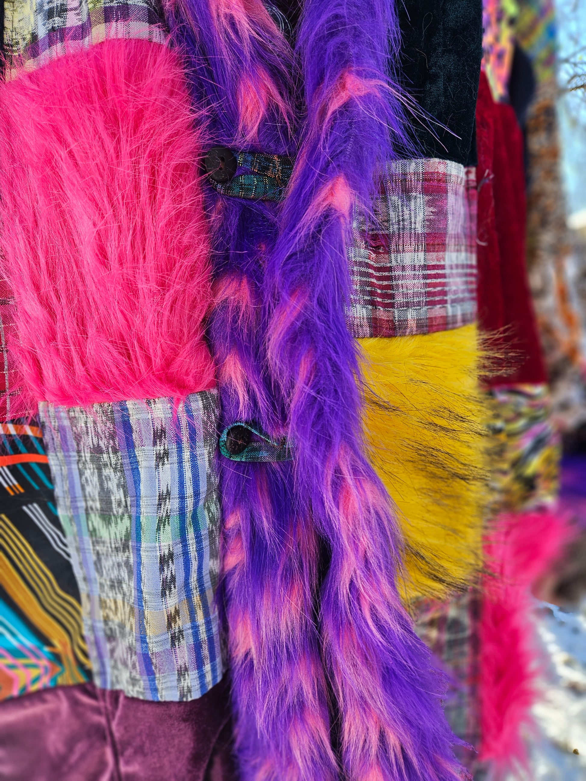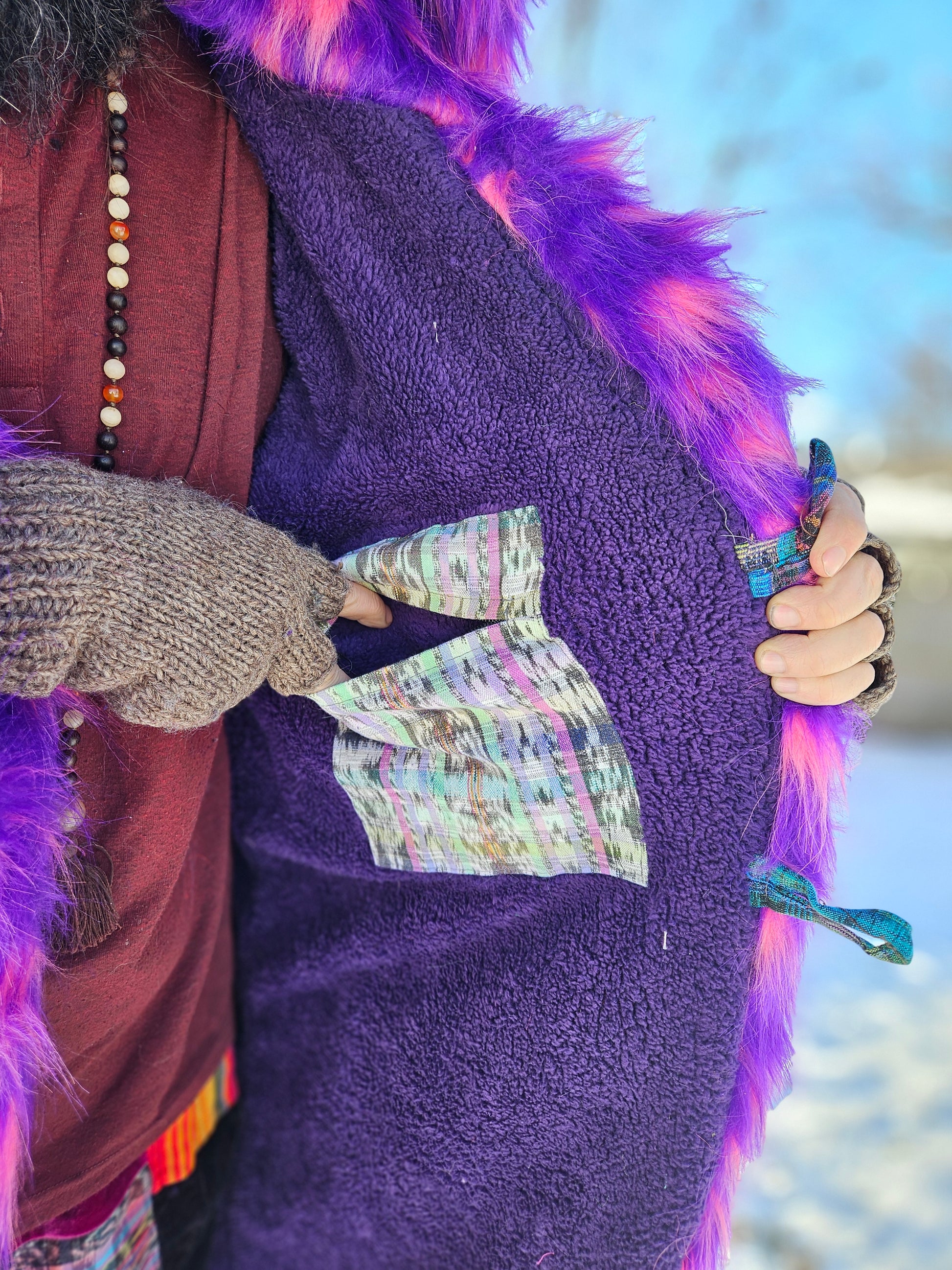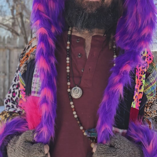 Liberate your journey and Funk up your Vibe with the latest Patchwork Cloak by Moksha Moda. This one-of-a-kind wearable work of art is ethically crafted in Guatemala with the scraps of the different collections that have been crafted over the past few years by the team of Moksha Moda. Textiles included in this patchwork cloak are beautiful upcycled fabrics from traditional hand-woven cotton Mayan skirts sourced from second-hand markets in Guatemala, wild polyester prints, luxurious faux fur, and elegant velvet. The cloak includes three pockets including an inside zipper pocket, is fleece lined, two front coconut buttons, and has a wild faux fur hood.