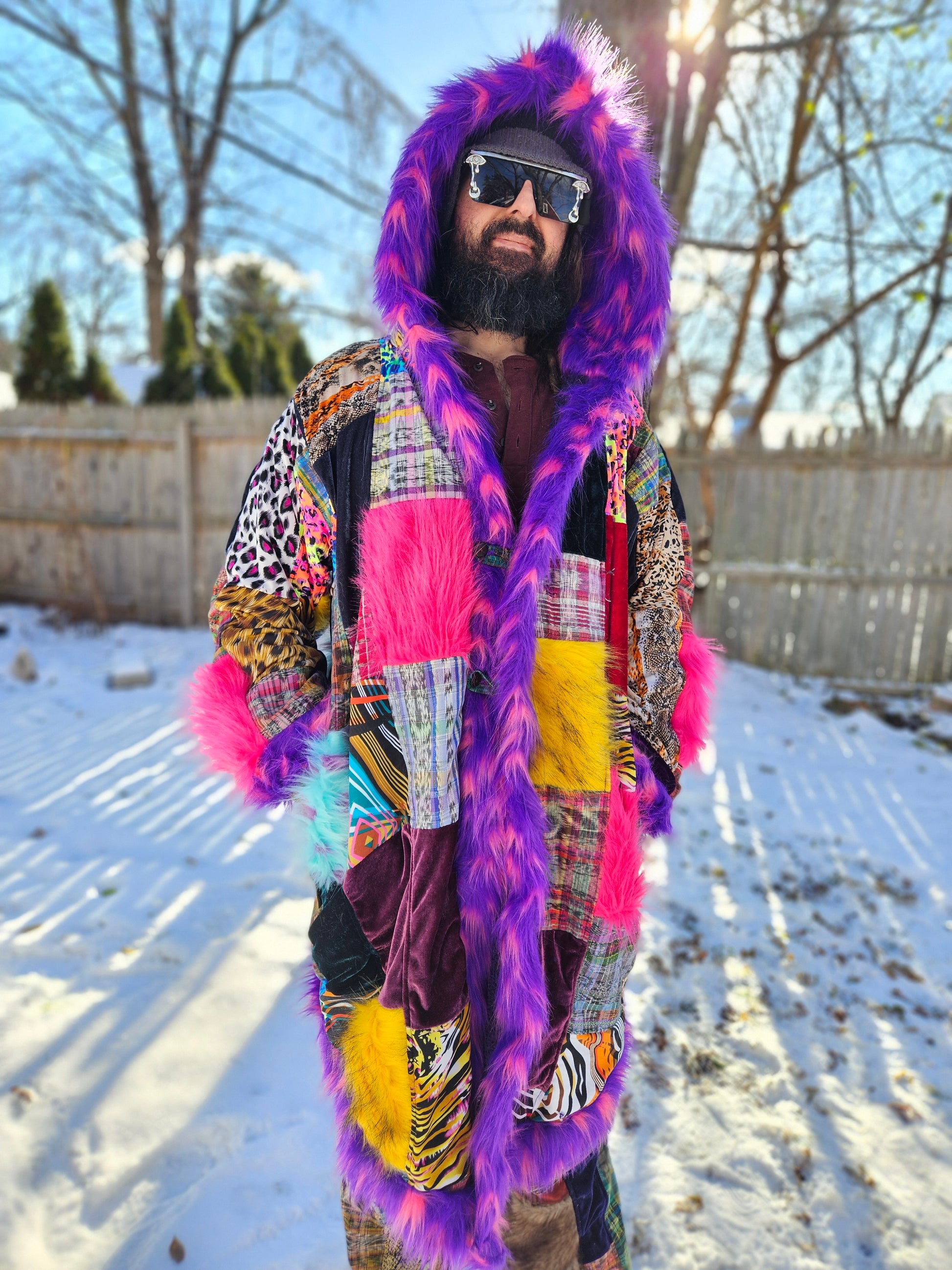 Each Moksha Moda patchwork cloak is a one-of-a-kind wearable work of art. With its unique blend of ethical craftsmanship, upcycled materials, and funky style, this patchwork cloak is sure to Funk Up Your Vibe, Liberate your Fashion, and it is ready for an adventure of a lifetime.