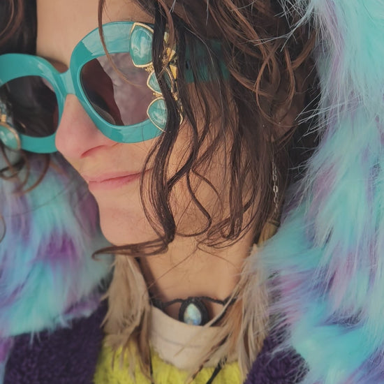 Each Moksha Moda patchwork cloak is a one-of-a-kind wearable work of art. With its unique blend of ethical craftsmanship, upcycled materials, and funky style, this patchwork cloak is sure to Funk Up Your Vibe, Liberate your Fashion, and it is ready for an adventure of a lifetime.