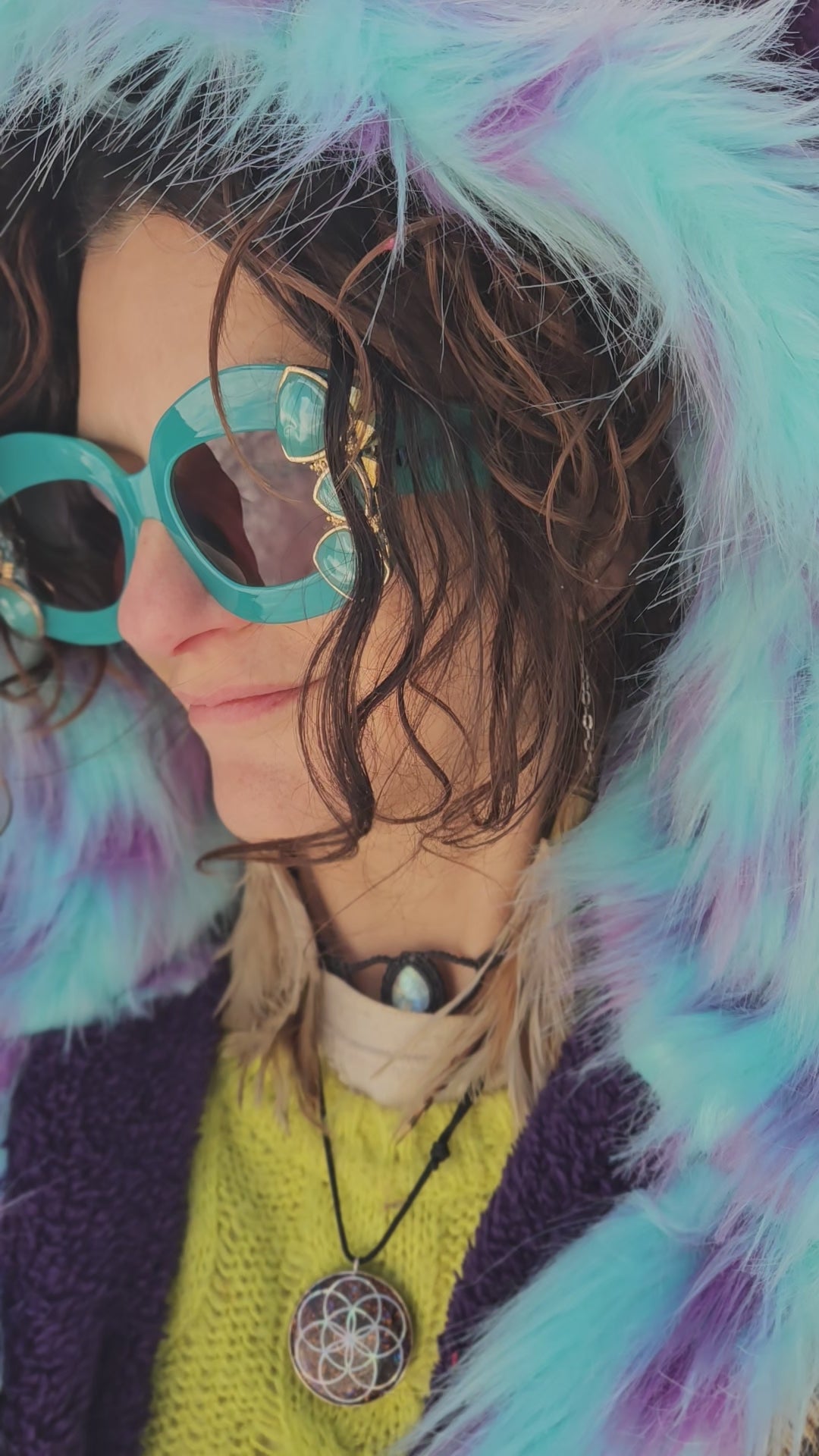 Liberate your journey and Funk up your Vibe with the latest Patchwork Cloak by Moksha Moda. This one-of-a-kind wearable work of art is ethically crafted in Guatemala with the scraps of the different collections that have been crafted over the past few years by the team of Moksha Moda. Textiles included in this patchwork cloak are beautiful upcycled fabrics from traditional hand-woven cotton Mayan skirts sourced from second-hand markets in Guatemala, wild polyester prints, luxurious faux fur, and elegant velvet. The cloak includes three pockets including an inside zipper pocket, is fleece lined, two front coconut buttons, and has a wild faux fur hood.