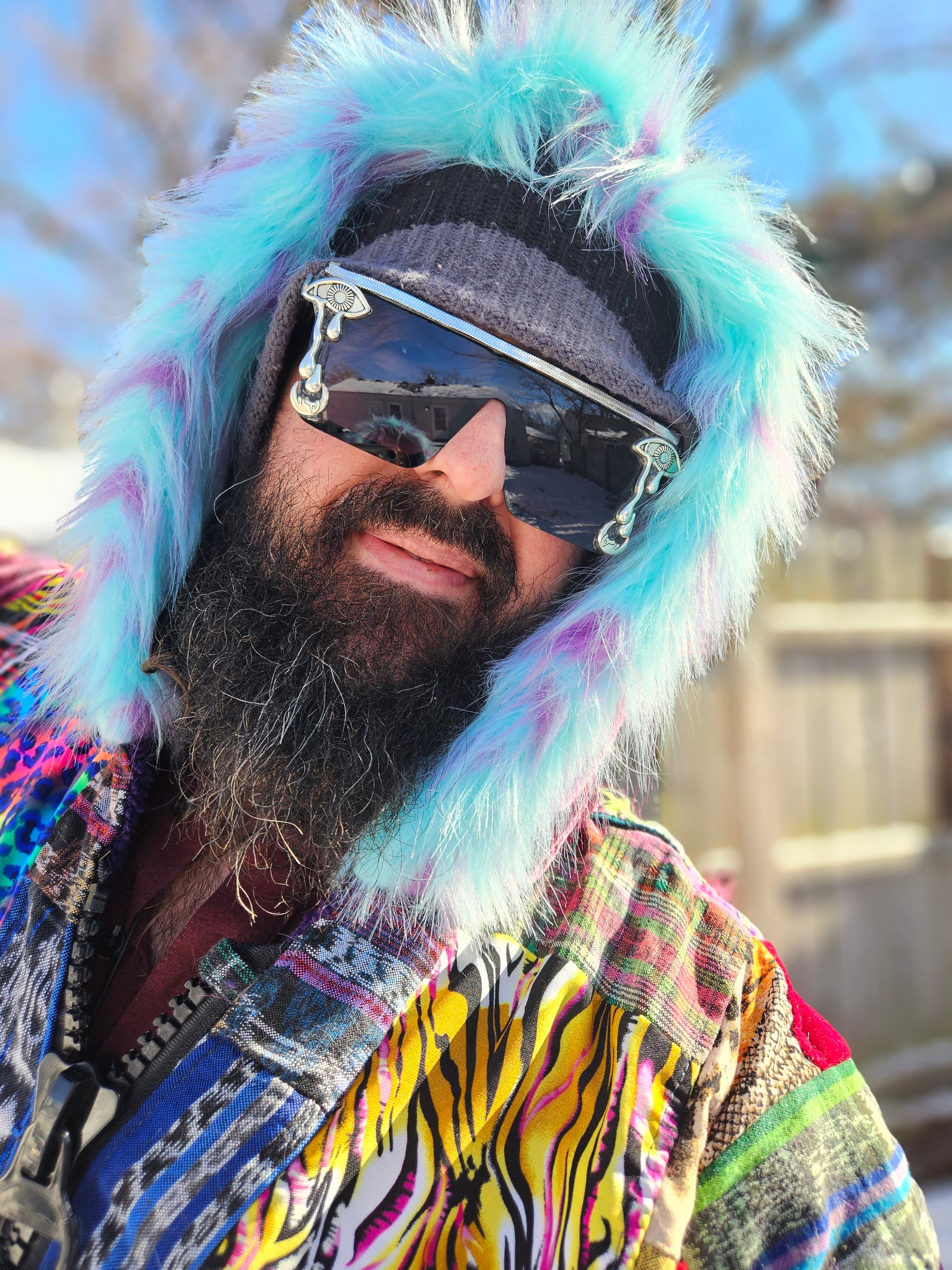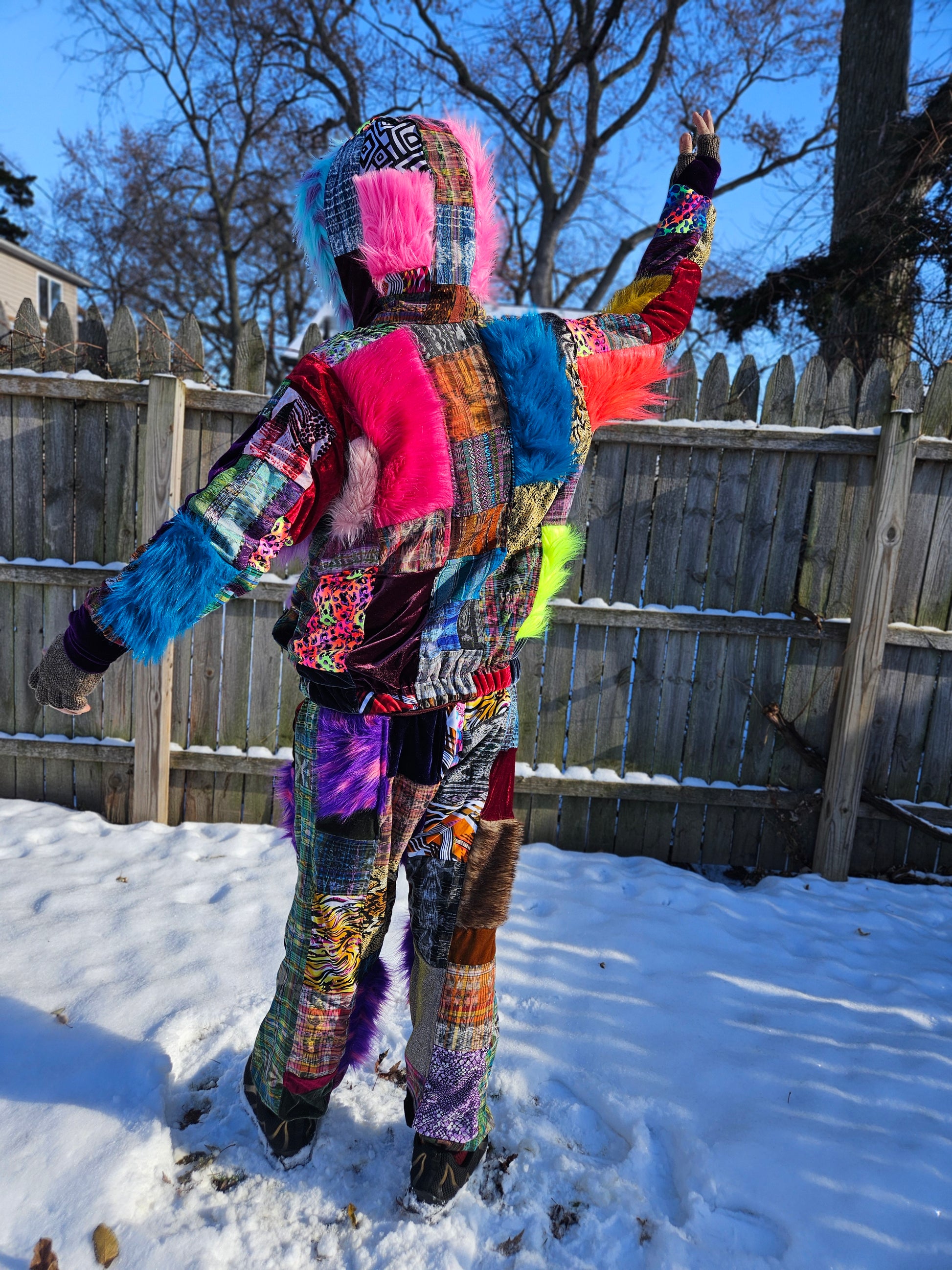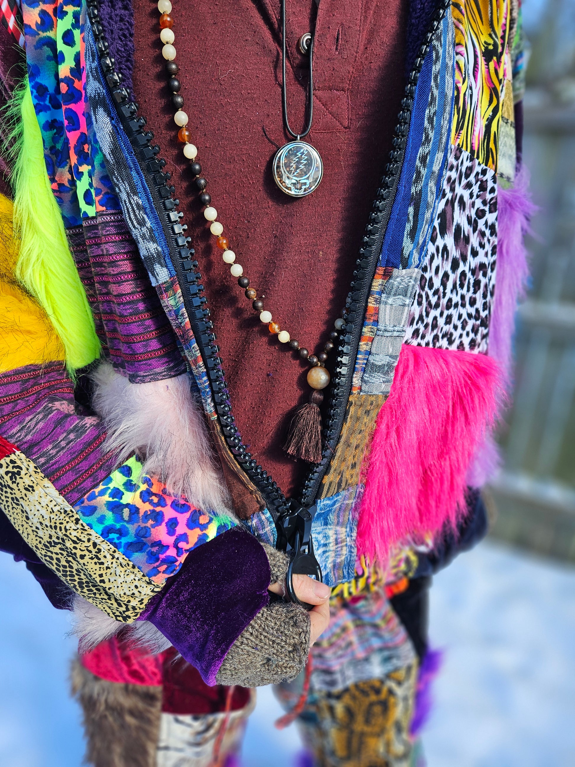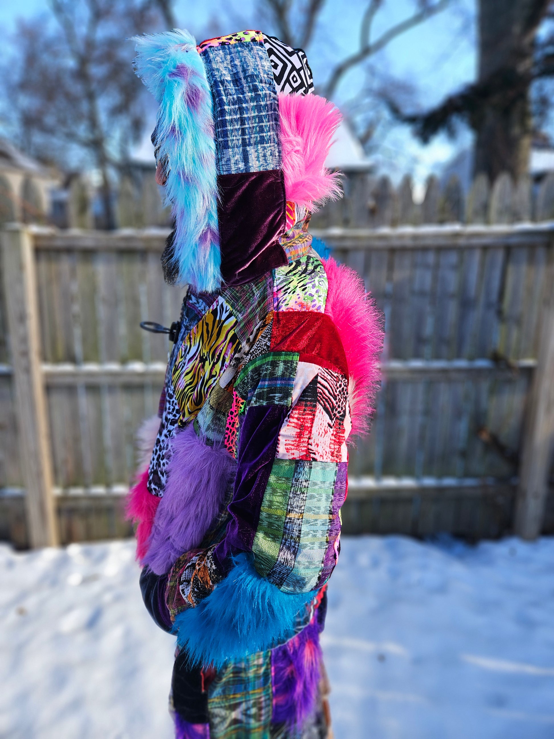 Liberate your journey and Funk up your Vibe with the latest Patchwork Jacket by Moksha Moda. This one-of-a-kind wearable work of art is ethically crafted in Guatemala with the scraps of the different collections that have been crafted over the past few years by the team of Moksha Moda. Textiles included in this patchwork cloak are beautiful upcycled fabrics from traditional hand-woven Mayan skirts sourced from second-hand markets in Guatemala, wild polyester prints, luxurious faux fur, and elegant velvet. The jacket includes three pockets including an inside zipper pocket, is fleece lined, elastic waist, thumb holes in the cuffs, a ridiculous large zipper, and has a wild faux fur hood.