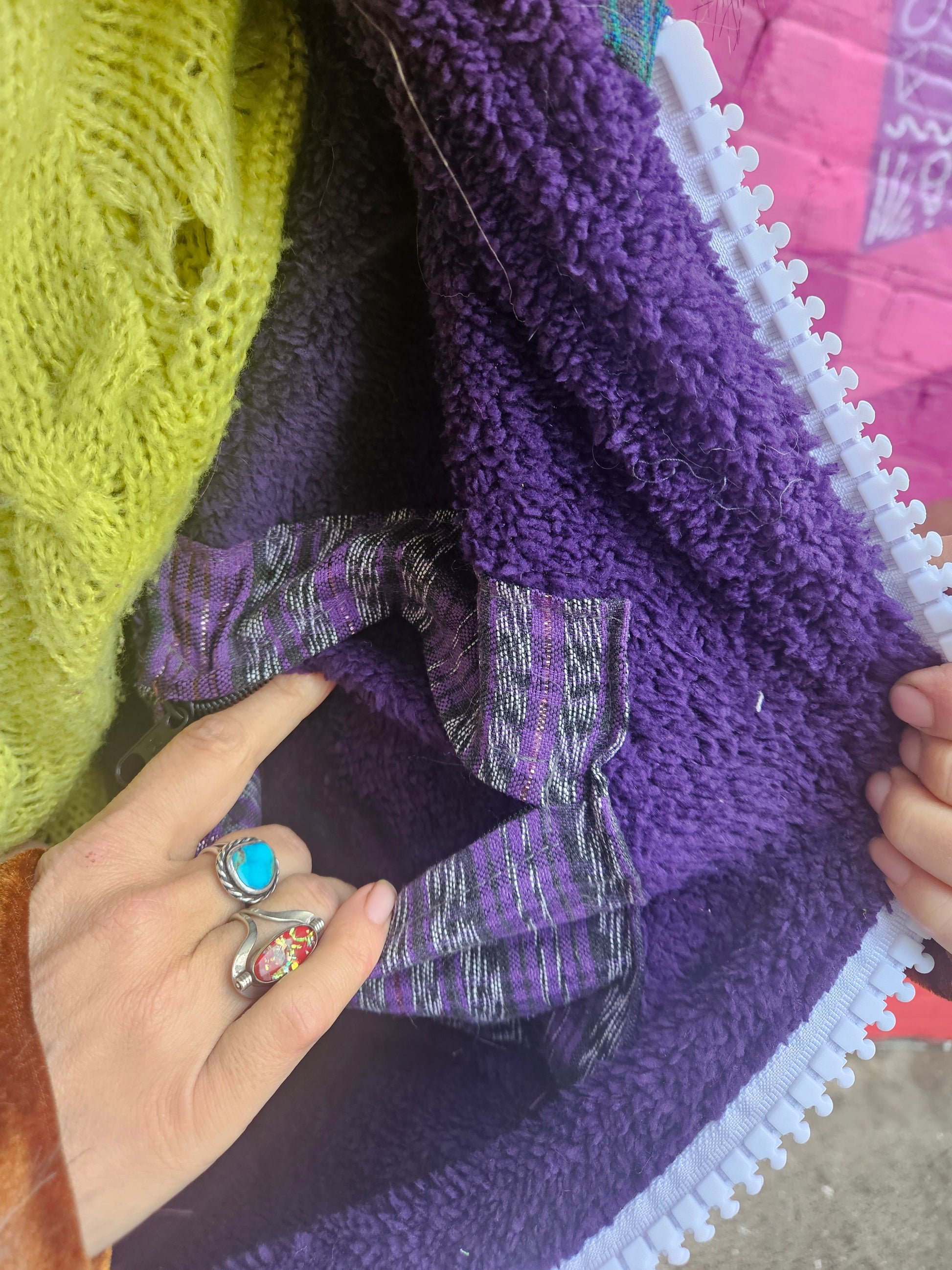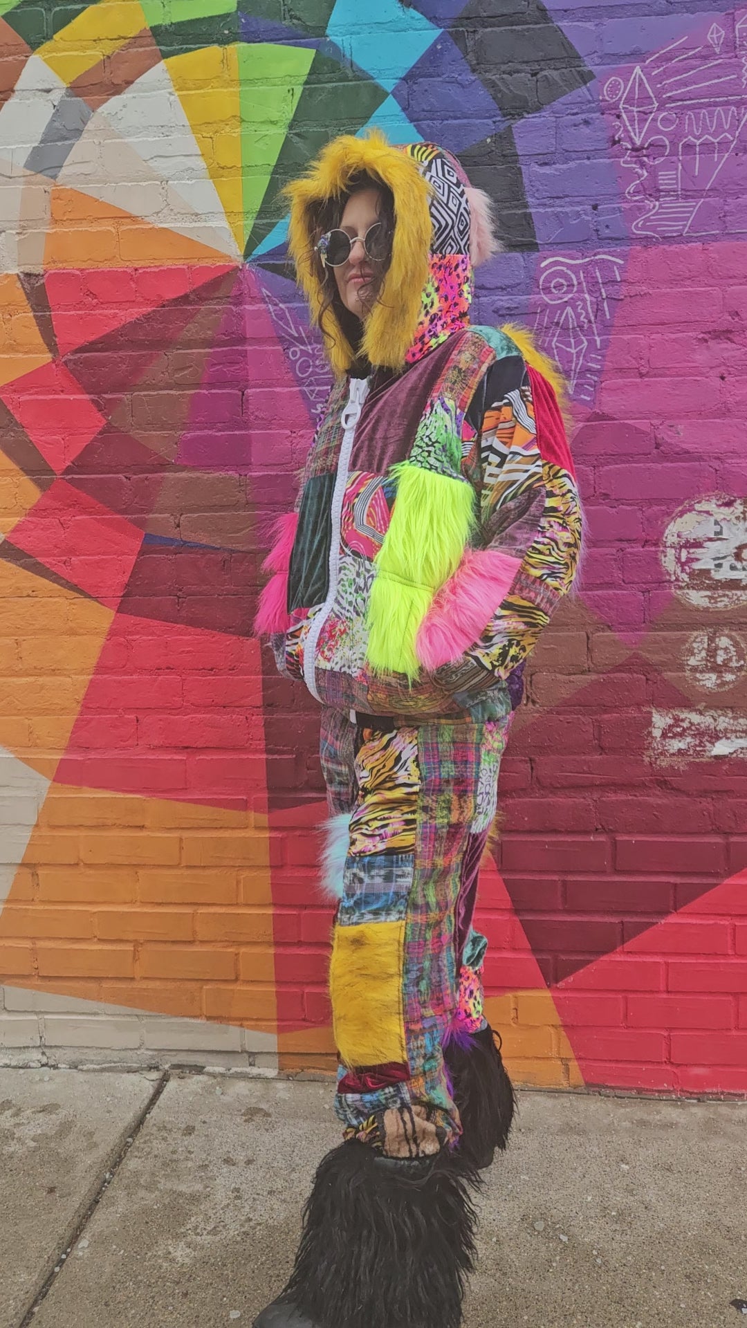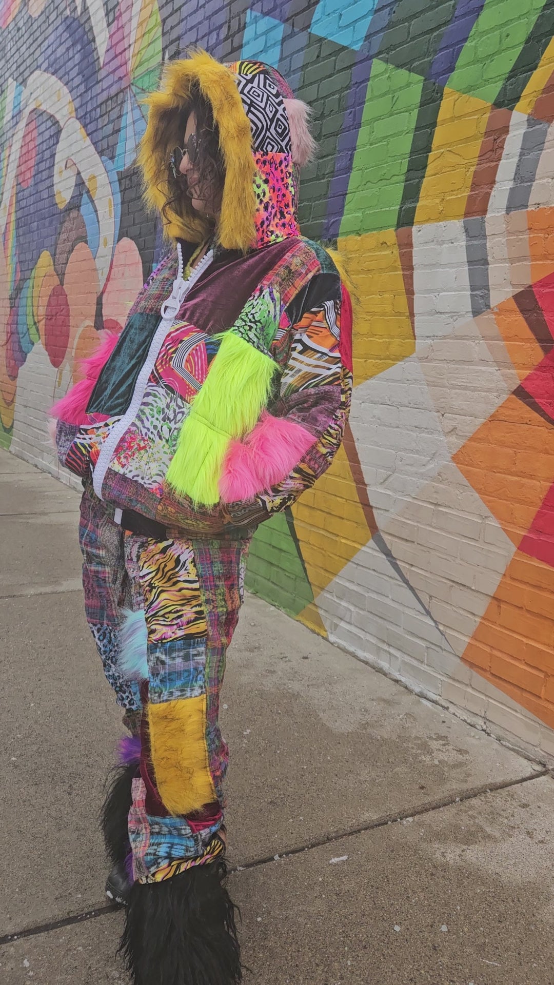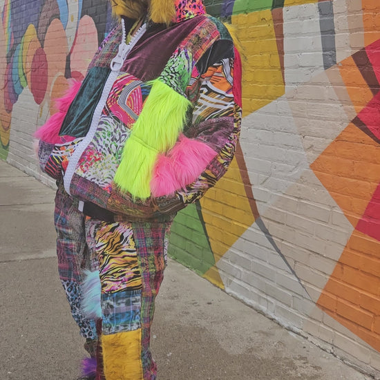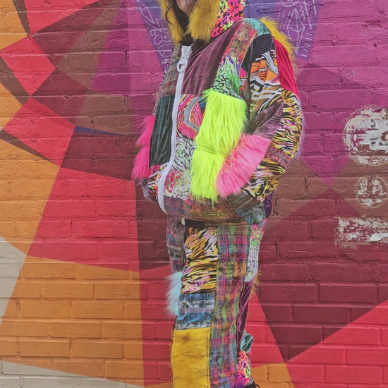 Liberate your journey and Funk up your Vibe with the latest Patchwork Jacket by Moksha Moda. This one-of-a-kind wearable work of art is ethically crafted in Guatemala with the scraps of the different collections that have been crafted over the past few years by the team of Moksha Moda. Textiles included in this patchwork cloak are beautiful upcycled fabrics from traditional hand-woven Mayan skirts sourced from second-hand markets in Guatemala, wild polyester prints, luxurious faux fur, and elegant velvet. The jacket includes three pockets including an inside zipper pocket, is fleece lined, elastic waist, thumb holes in the cuffs, a ridiculous large zipper, and has a wild faux fur hood.