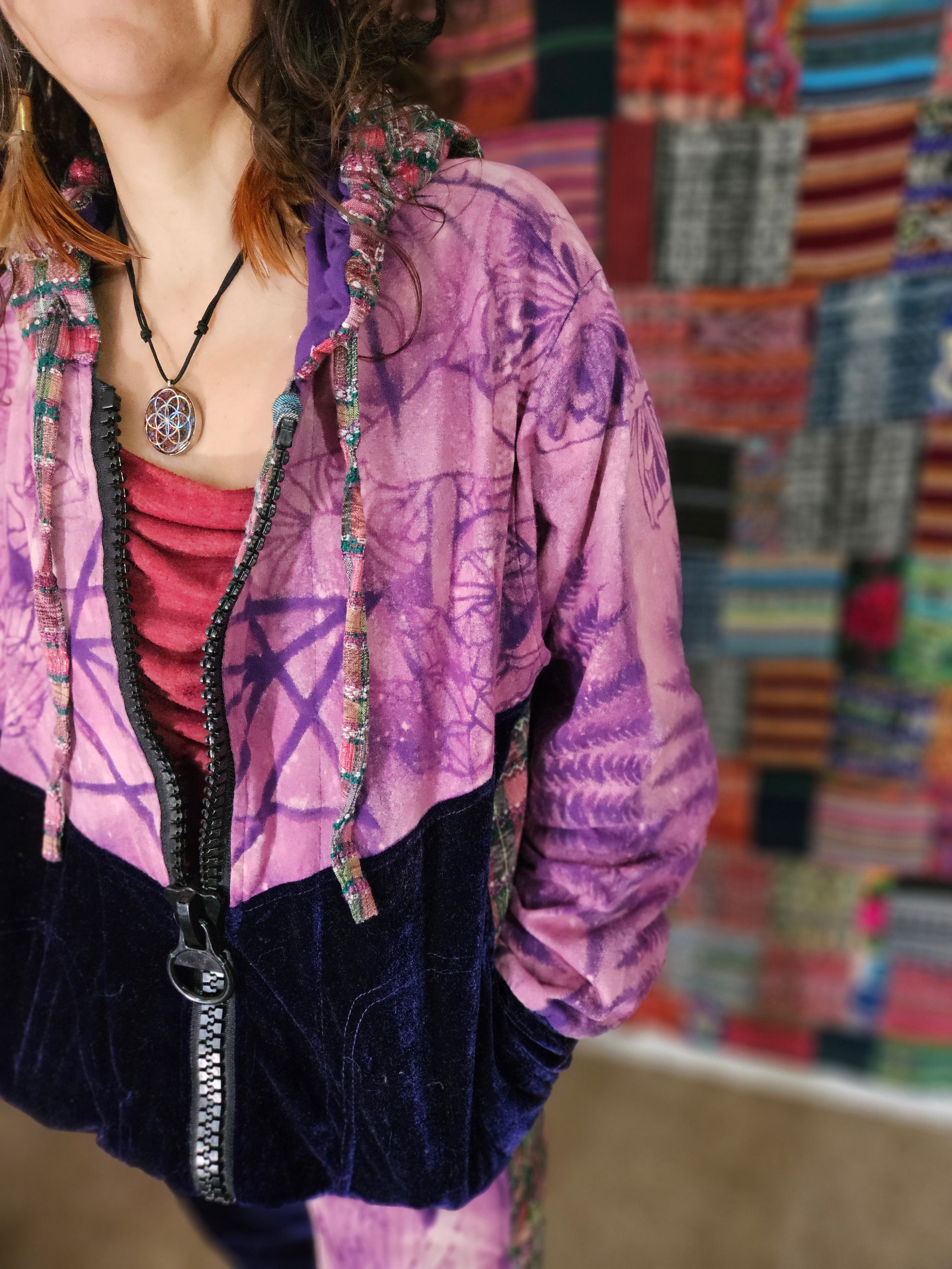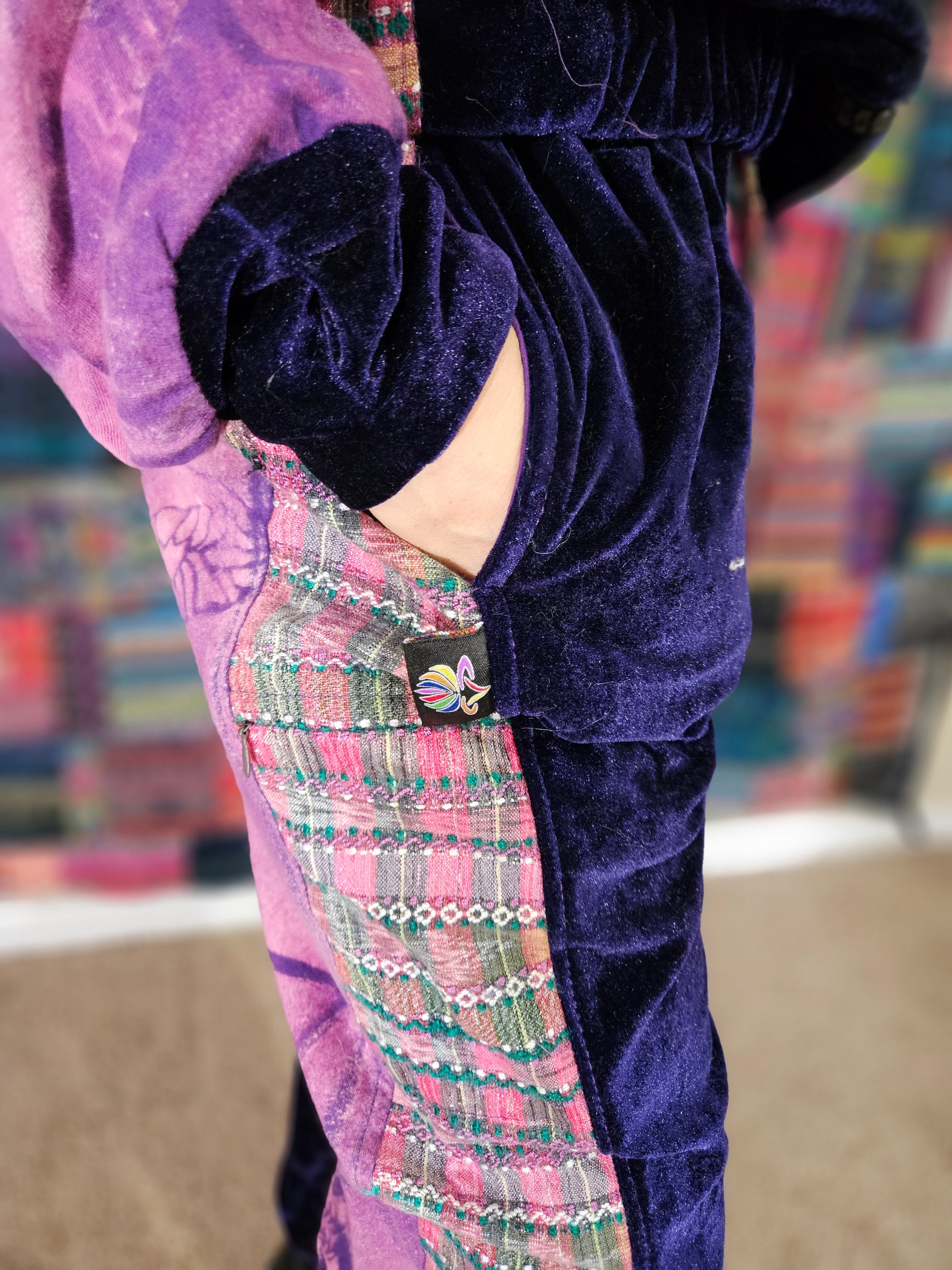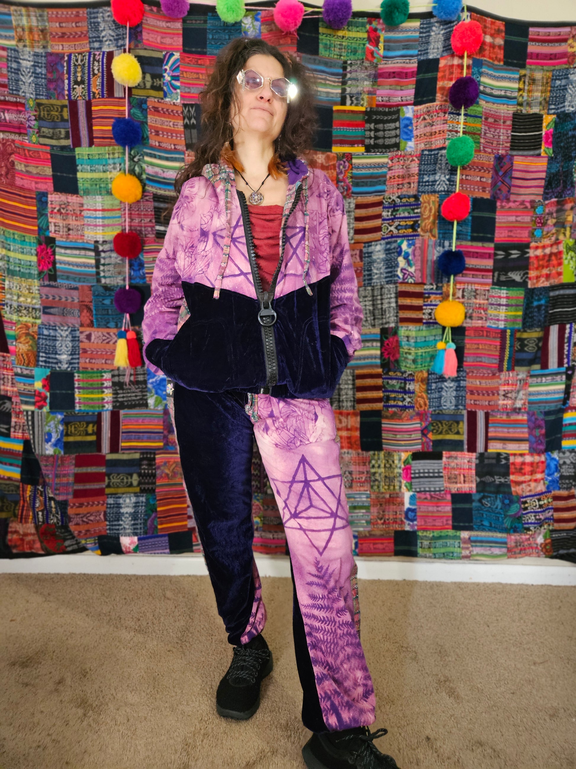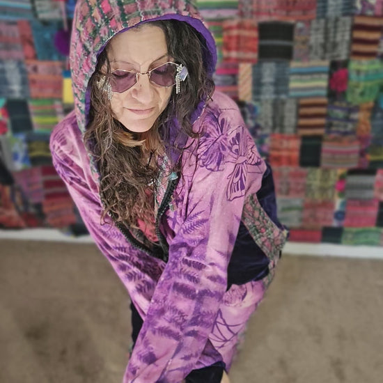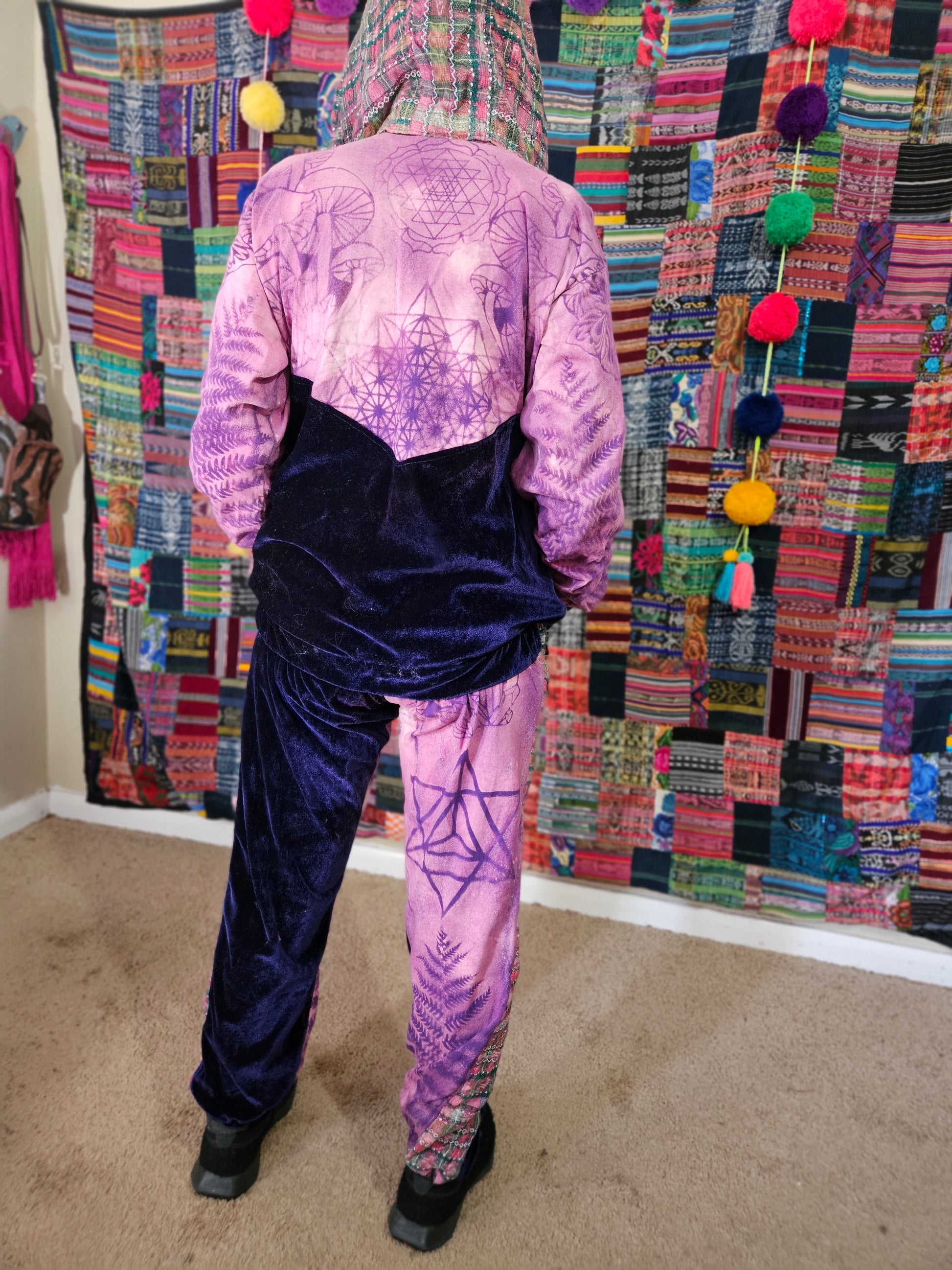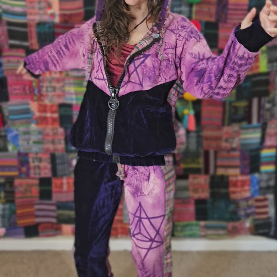 Funk up your vibe & liberate your fashion with this super heady one of a kind collab tracksuit fit by Moksha Moda & Jenzified Designz. The tracksuit is ethically crafted in Guatemala with beautiful upcycled hand woven Mayan fabric for the detail, elegant velvet, and super soft breathable jersey that is then shipped to Jenzified Designs in Maine for her to hand bleach stencil post production. This one of a kind tracksuit fit also features three pockets in the jacket including a velcro pocket in the hood, ridiculously large zipper, thumb holes in the sleeves, and three pockets in the joggers including one zipper pocket.