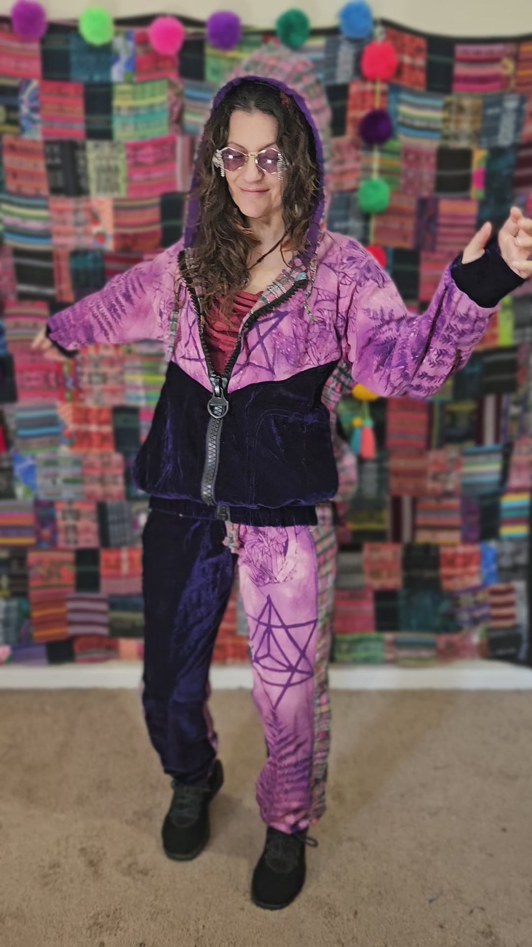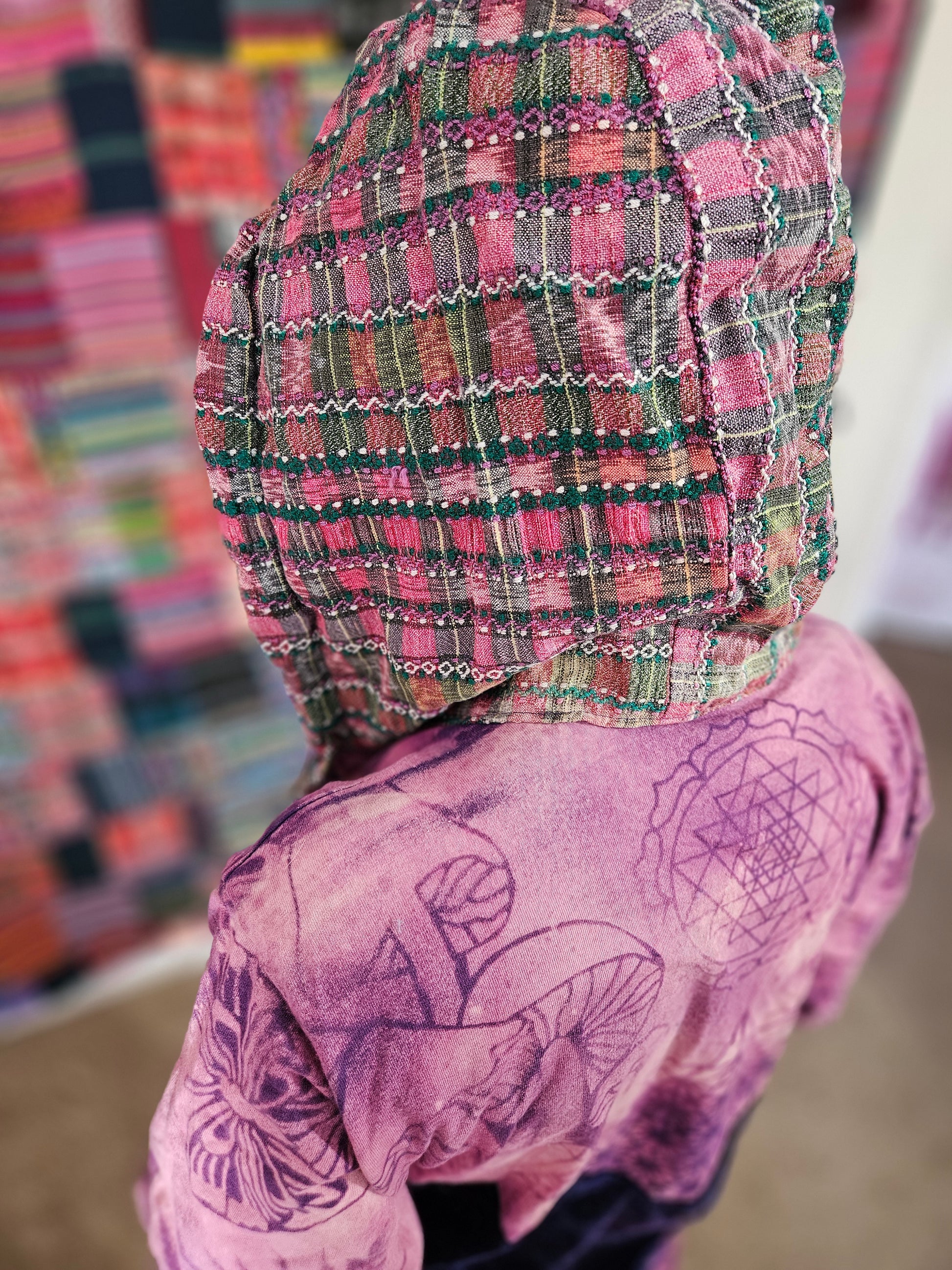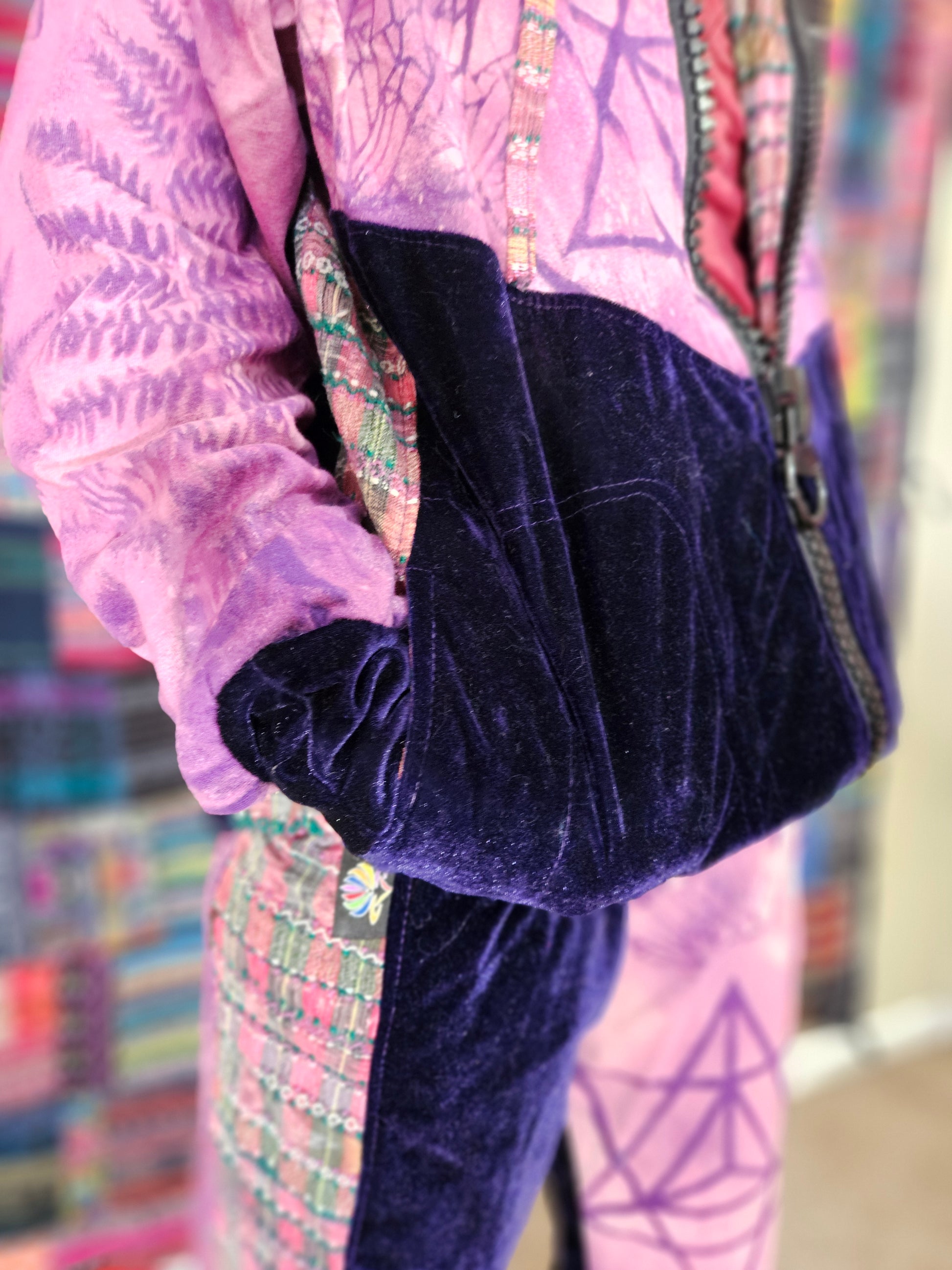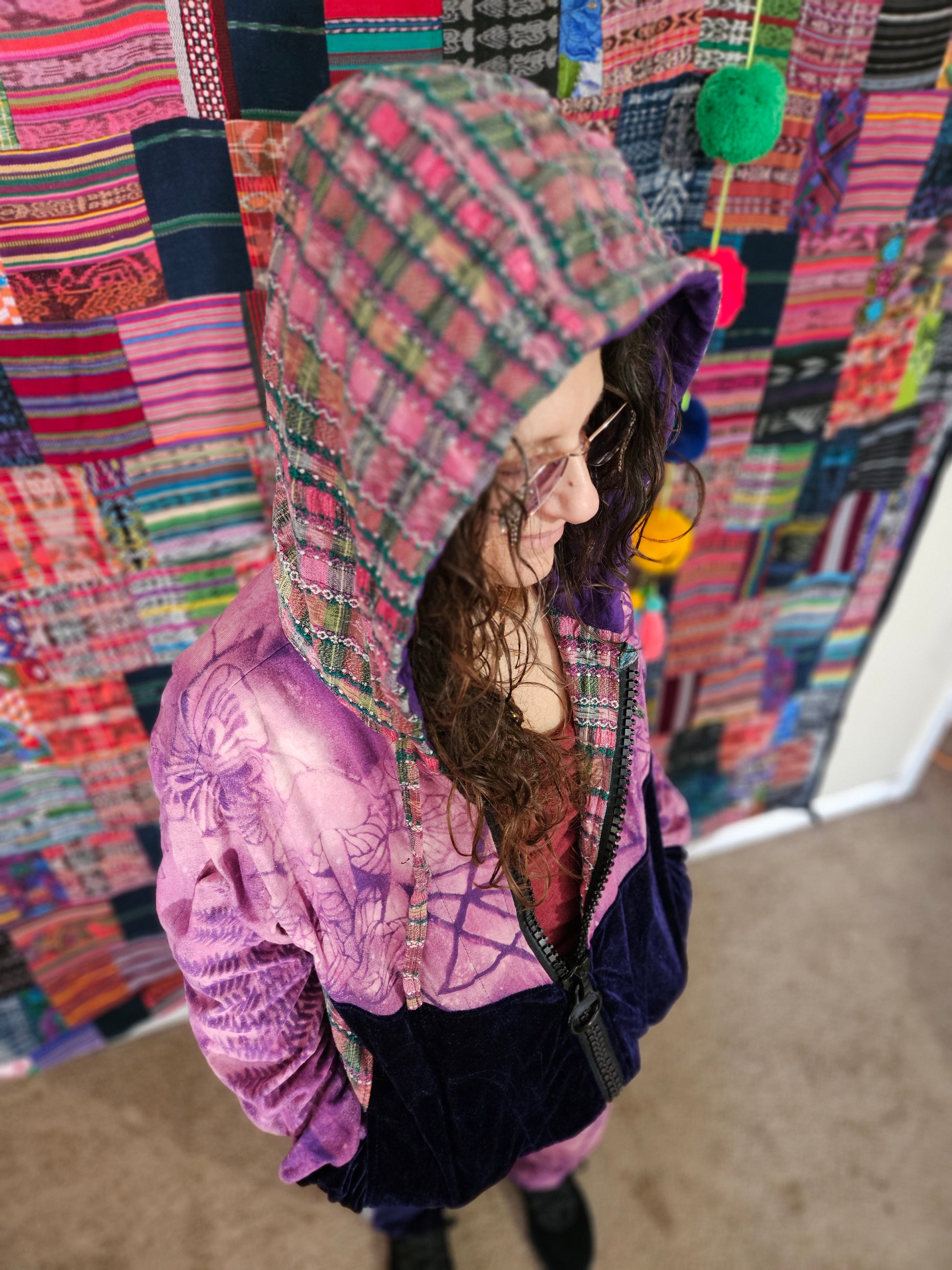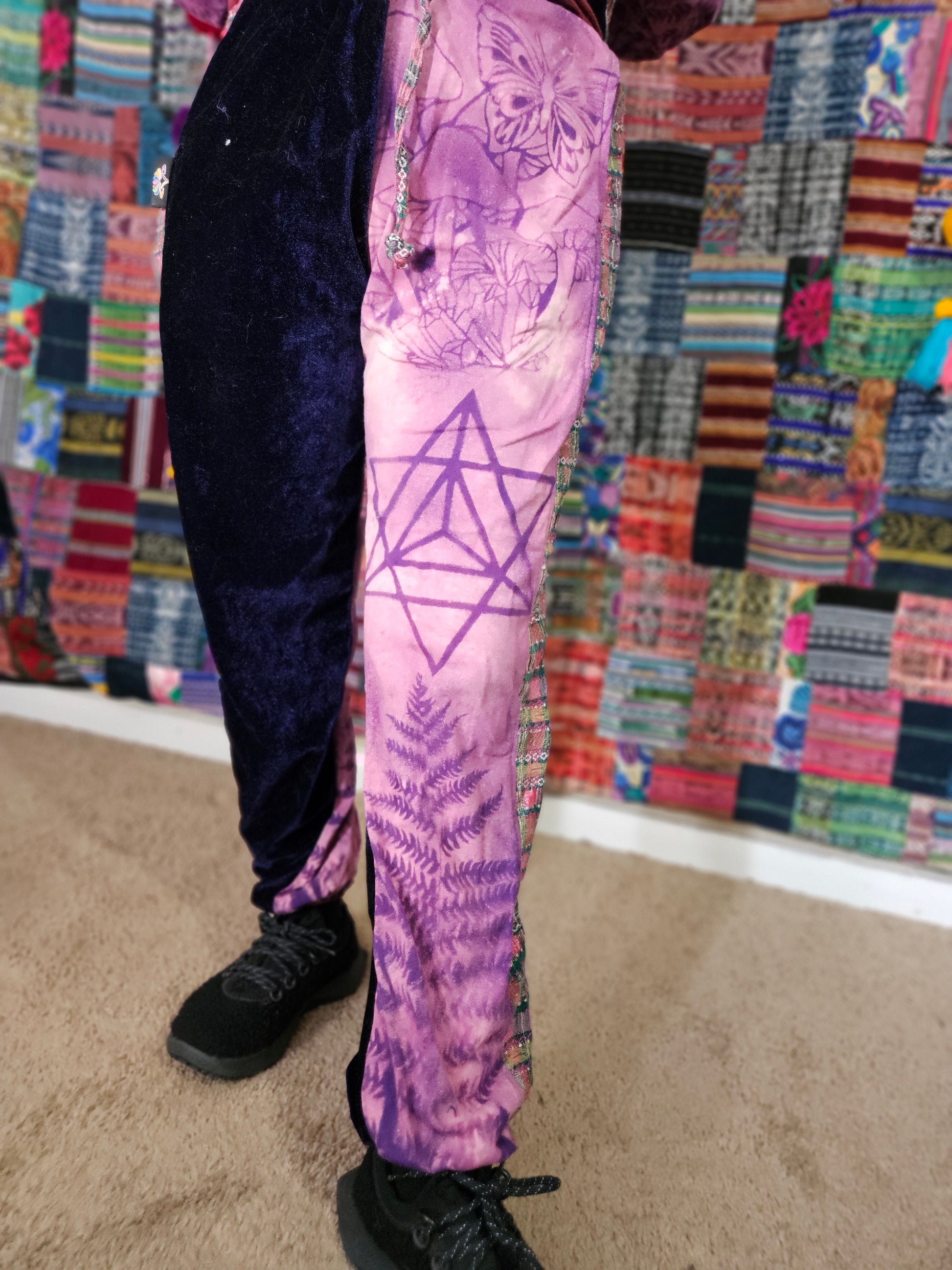 Funk up your vibe & liberate your fashion with this super heady one of a kind collab tracksuit fit by Moksha Moda & Jenzified Designz. The tracksuit is ethically crafted in Guatemala with beautiful upcycled hand woven Mayan fabric for the detail, elegant velvet, and super soft breathable jersey that is then shipped to Jenzified Designs in Maine for her to hand bleach stencil post production. This one of a kind tracksuit fit also features three pockets in the jacket including a velcro pocket in the hood, ridiculously large zipper, thumb holes in the sleeves, and three pockets in the joggers including one zipper pocket.