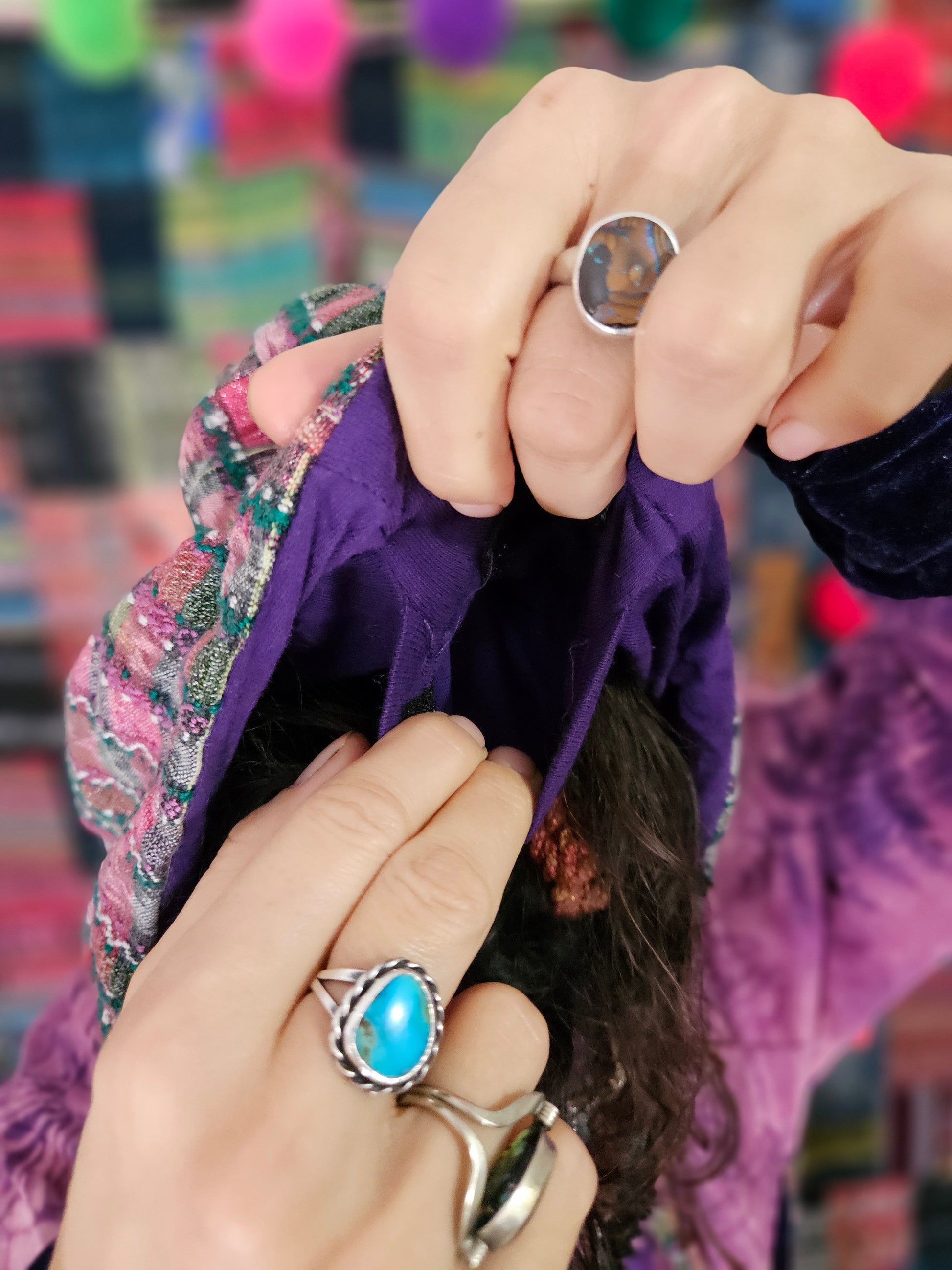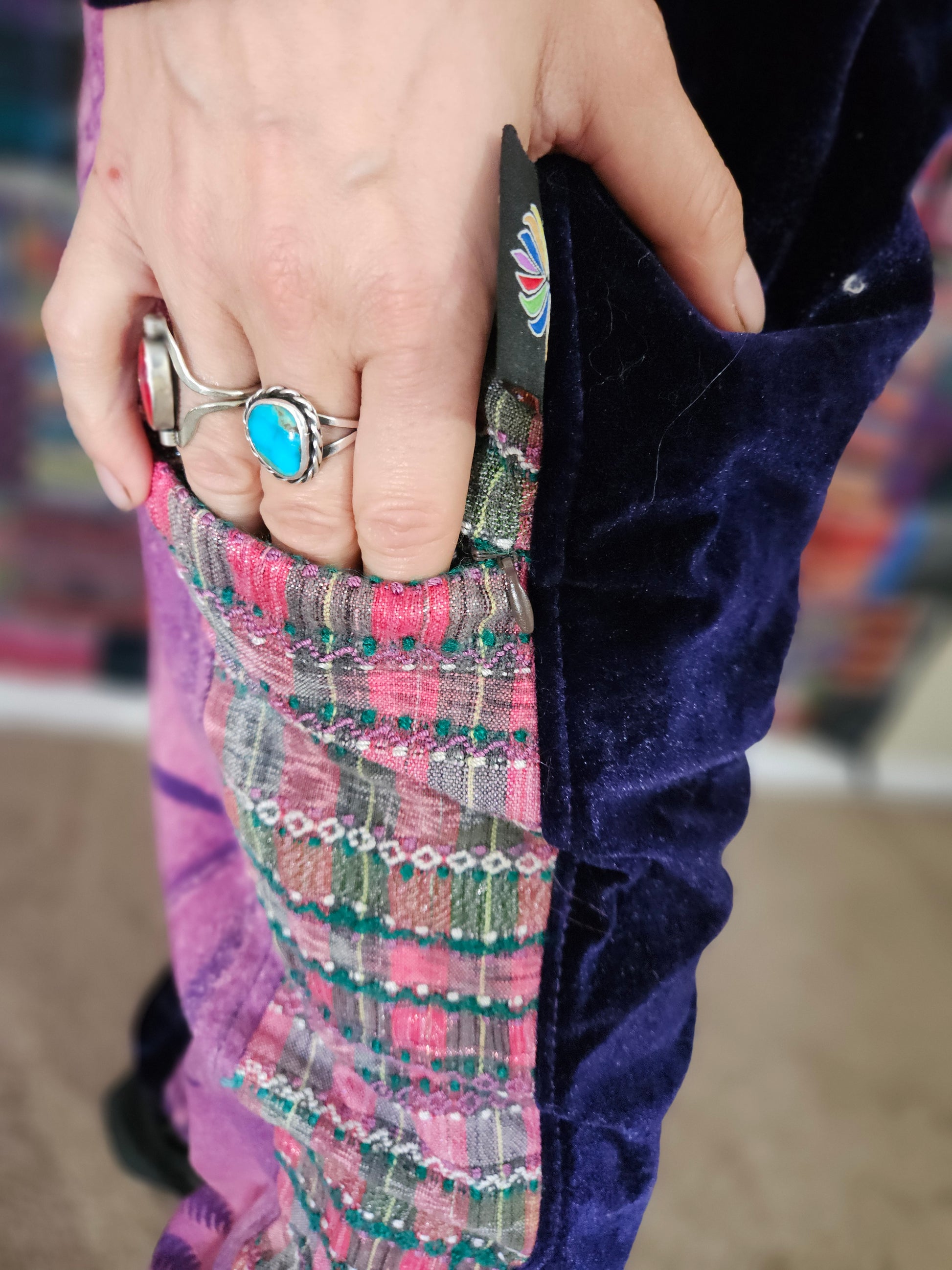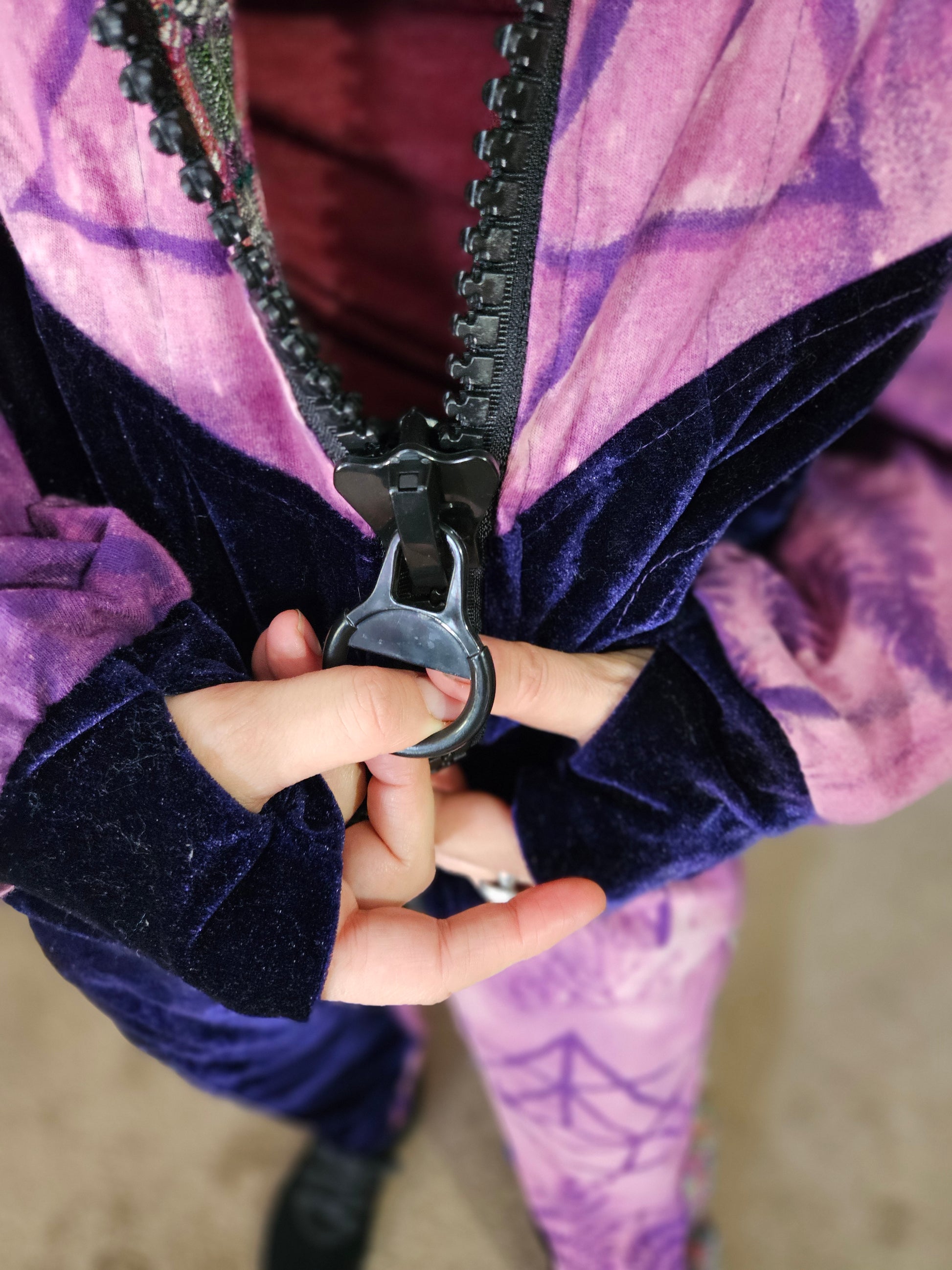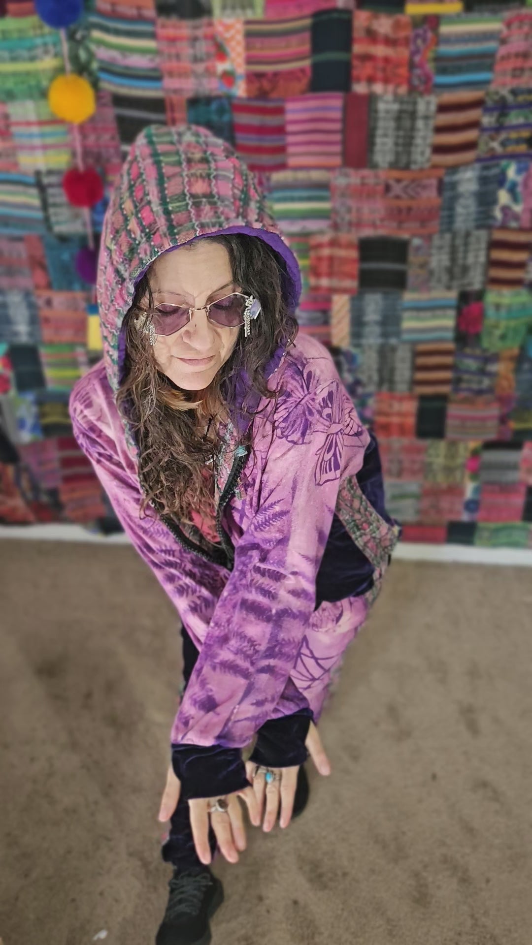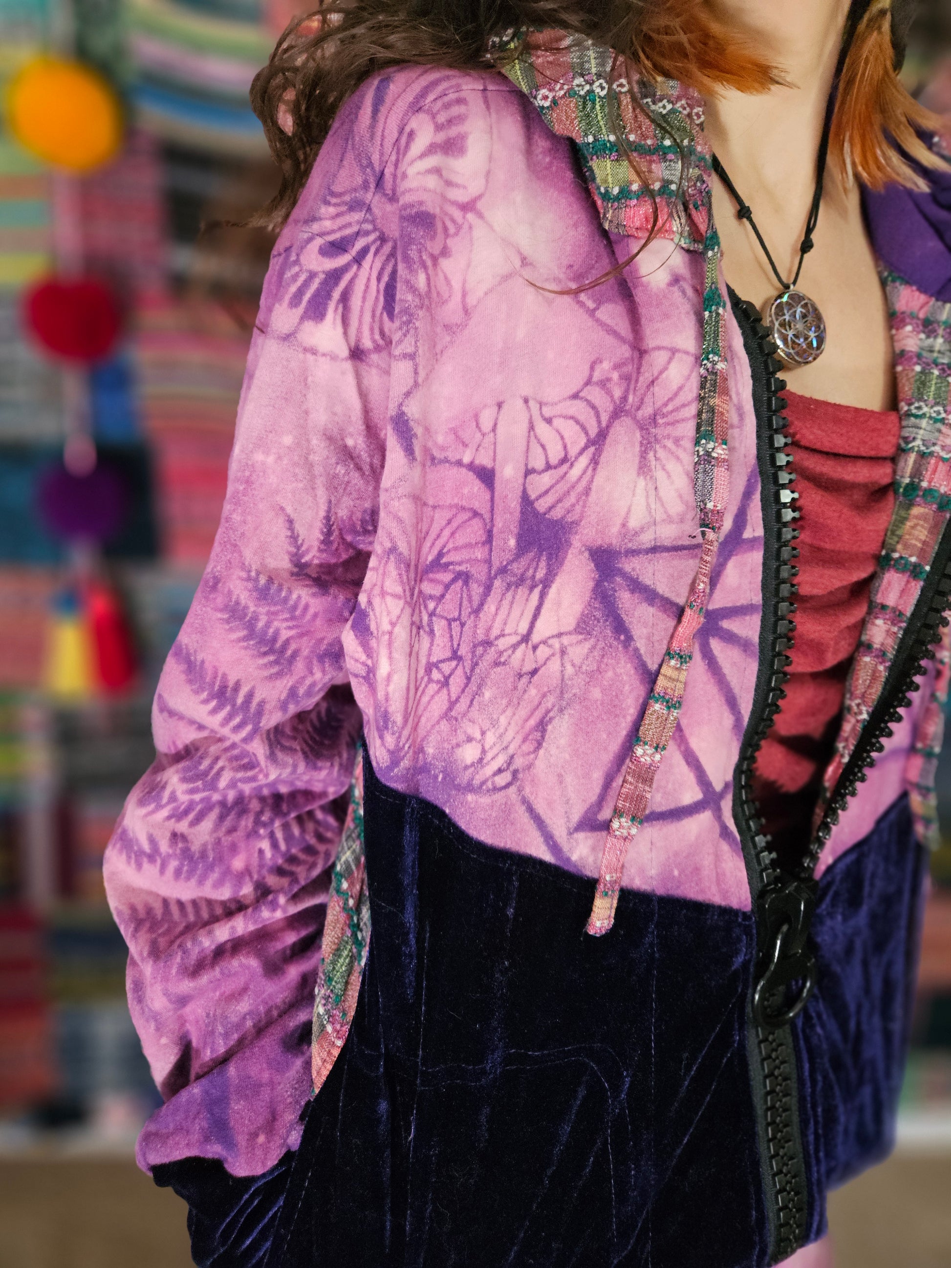 Funk up your vibe & liberate your fashion with this super heady one of a kind collab tracksuit fit by Moksha Moda & Jenzified Designz. The tracksuit is ethically crafted in Guatemala with beautiful upcycled hand woven Mayan fabric for the detail, elegant velvet, and super soft breathable jersey that is then shipped to Jenzified Designs in Maine for her to hand bleach stencil post production. This one of a kind tracksuit fit also features three pockets in the jacket including a velcro pocket in the hood, ridiculously large zipper, thumb holes in the sleeves, and three pockets in the joggers including one zipper pocket.
