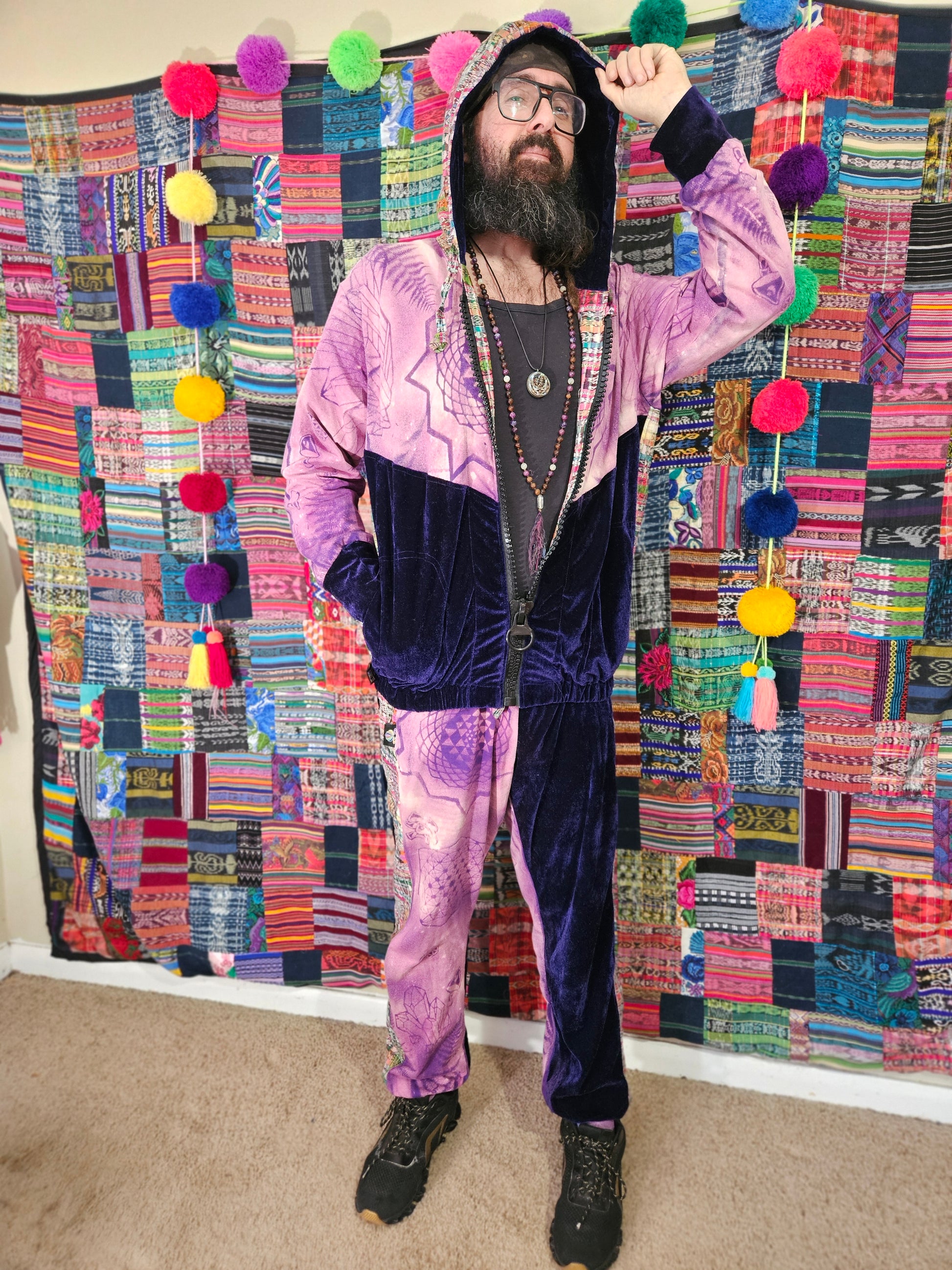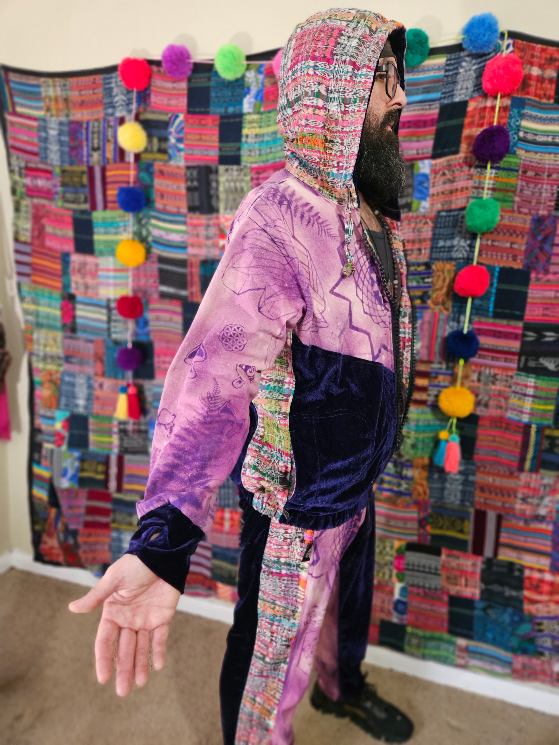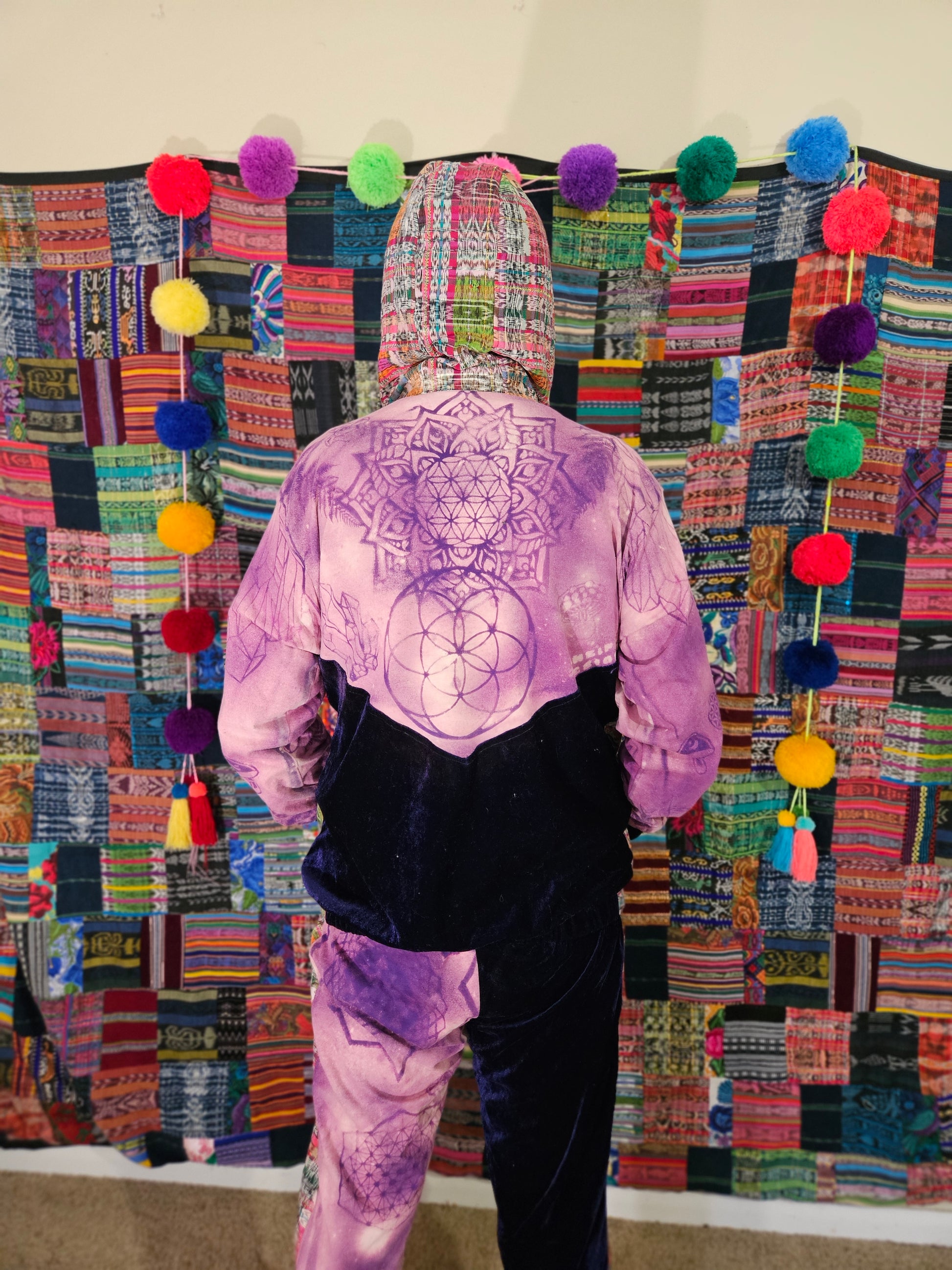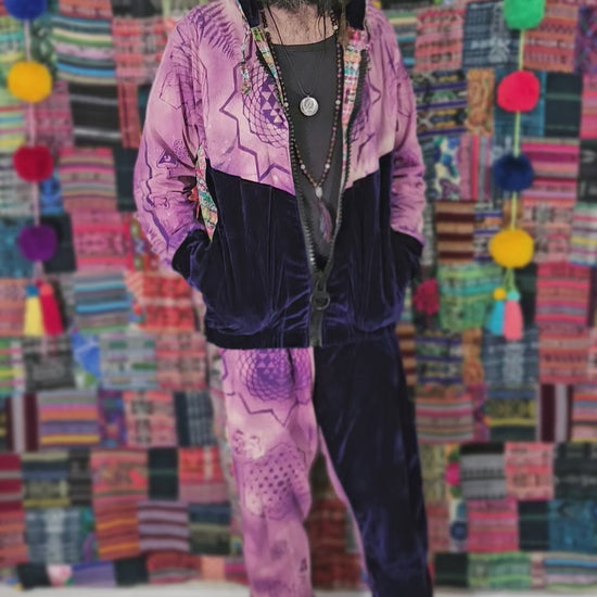 Funk up your vibe & liberate your fashion with this super heady one of a kind collab tracksuit fit by Moksha Moda & Jenzified Designz. The tracksuit is ethically crafted in Guatemala with beautiful upcycled hand woven Mayan fabric for the detail, elegant velvet, and super soft breathable jersey that is then shipped to Jenzified Designs in Maine for her to hand bleach stencil post production. This one of a kind tracksuit fit also features three pockets in the jacket including a velcro pocket in the hood, ridiculously large zipper, thumb holes in the sleeves, and three pockets in the joggers including one zipper pocket.