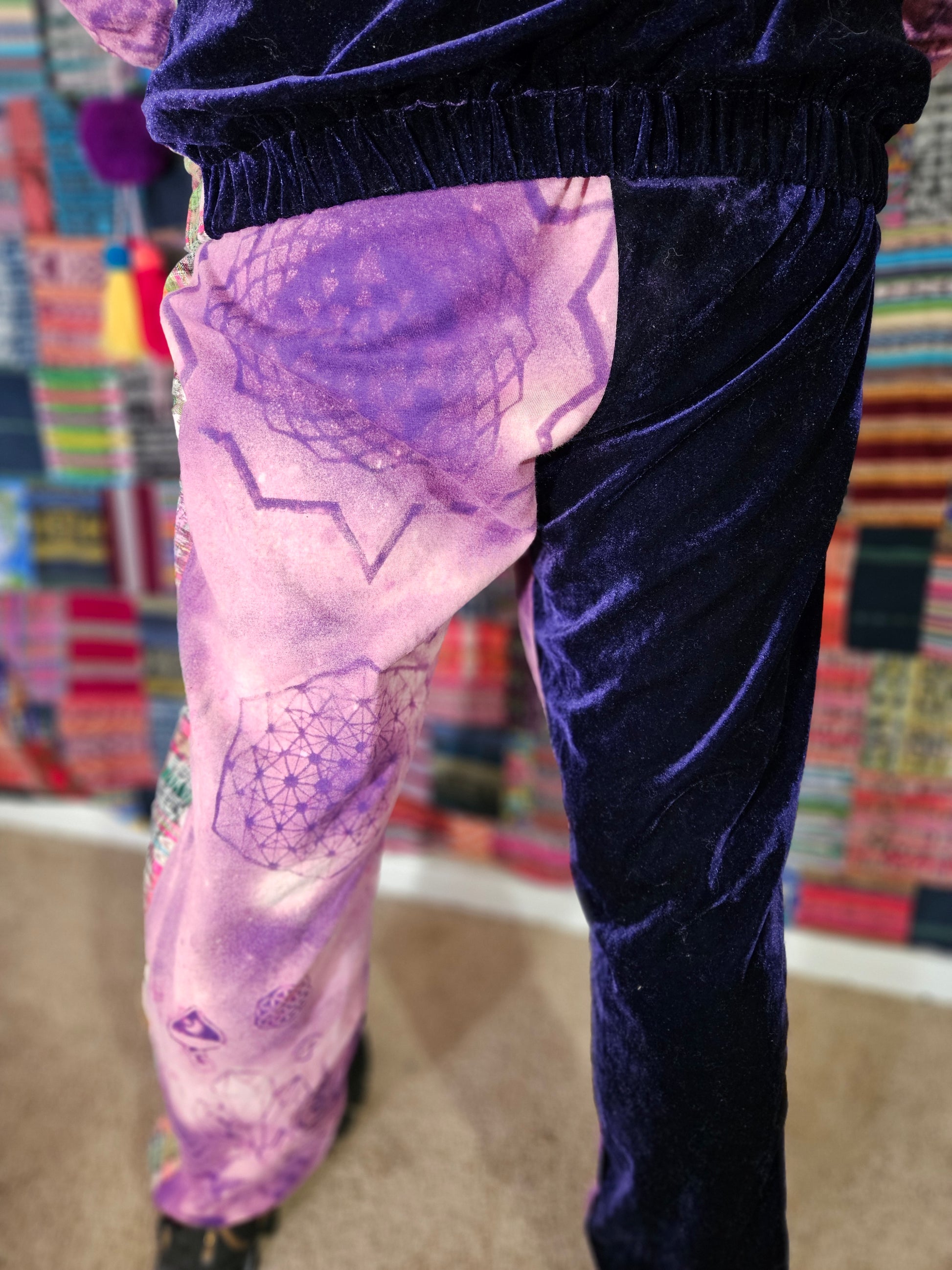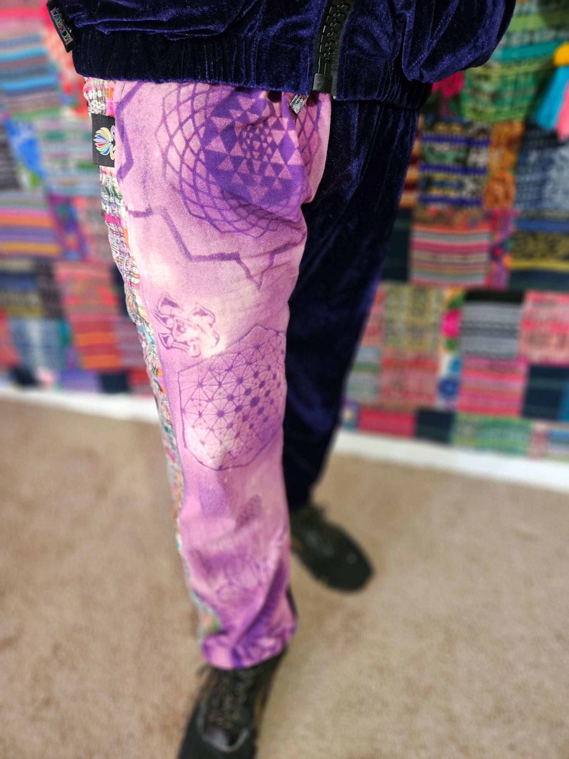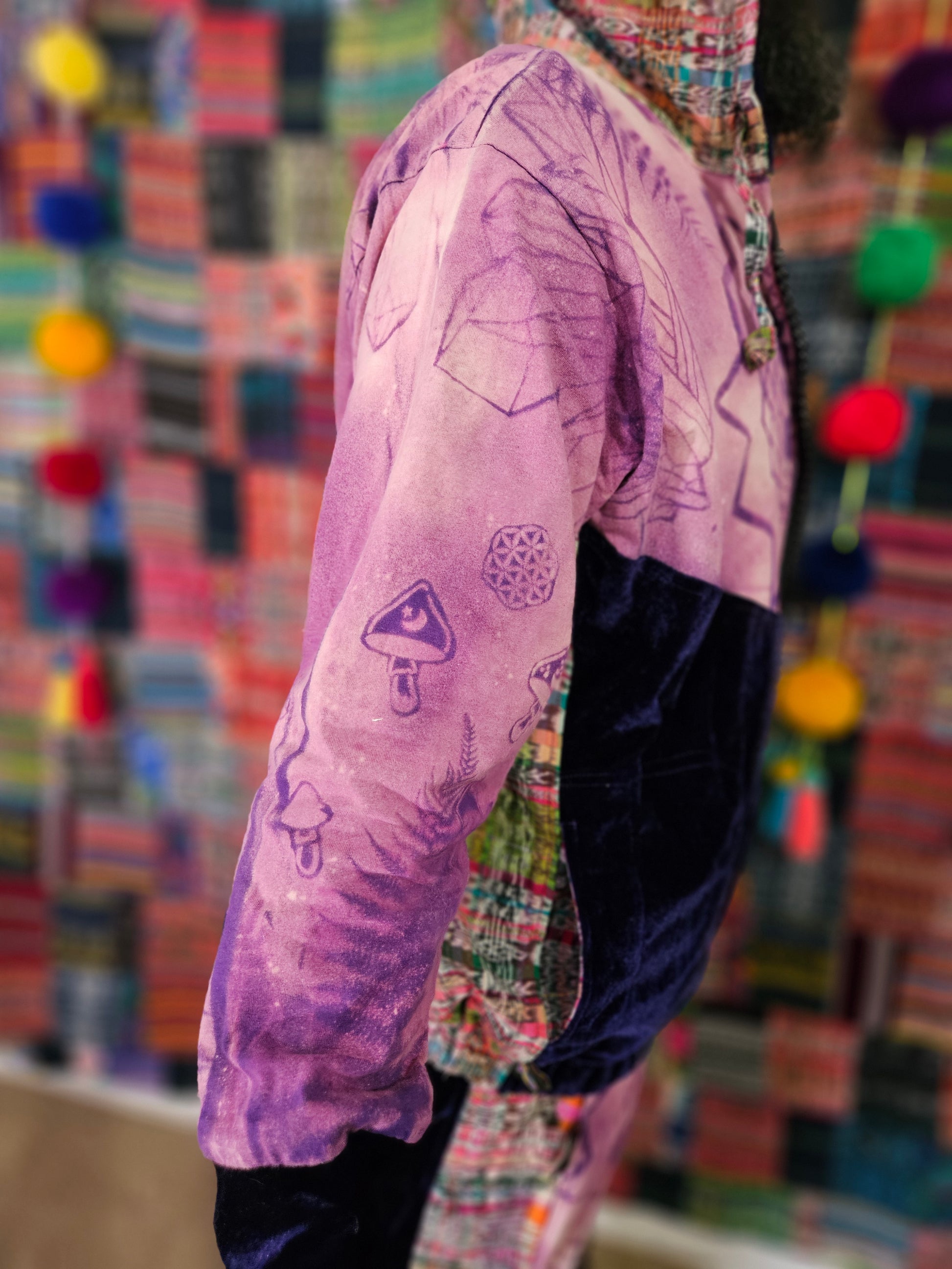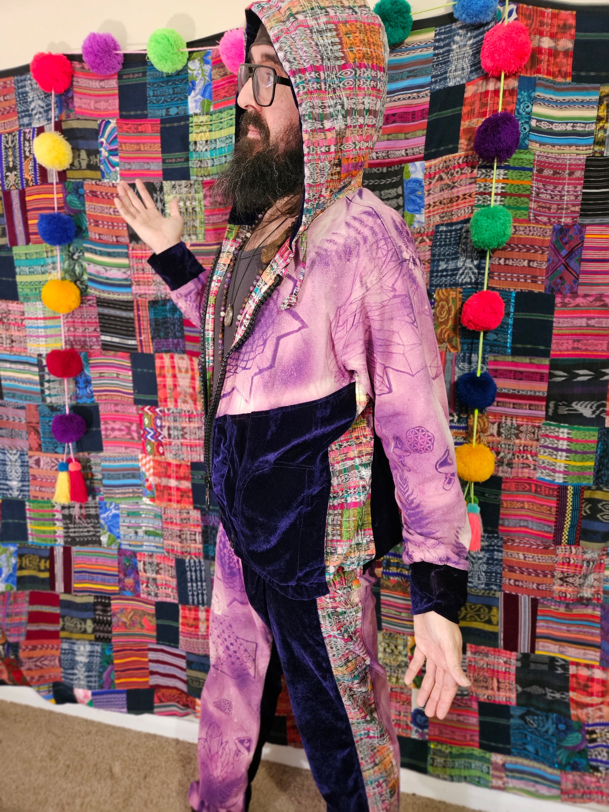Funk up your vibe & liberate your fashion with this super heady one of a kind collab tracksuit fit by Moksha Moda & Jenzified Designz. The tracksuit is ethically crafted in Guatemala with beautiful upcycled hand woven Mayan fabric for the detail, elegant velvet, and super soft breathable jersey that is then shipped to Jenzified Designs in Maine for her to hand bleach stencil post production. This one of a kind tracksuit fit also features three pockets in the jacket including a velcro pocket in the hood, ridiculously large zipper, thumb holes in the sleeves, and three pockets in the joggers including one zipper pocket.