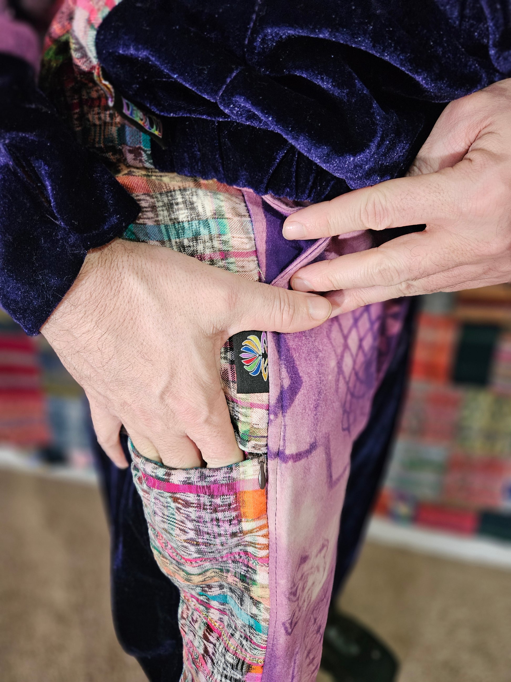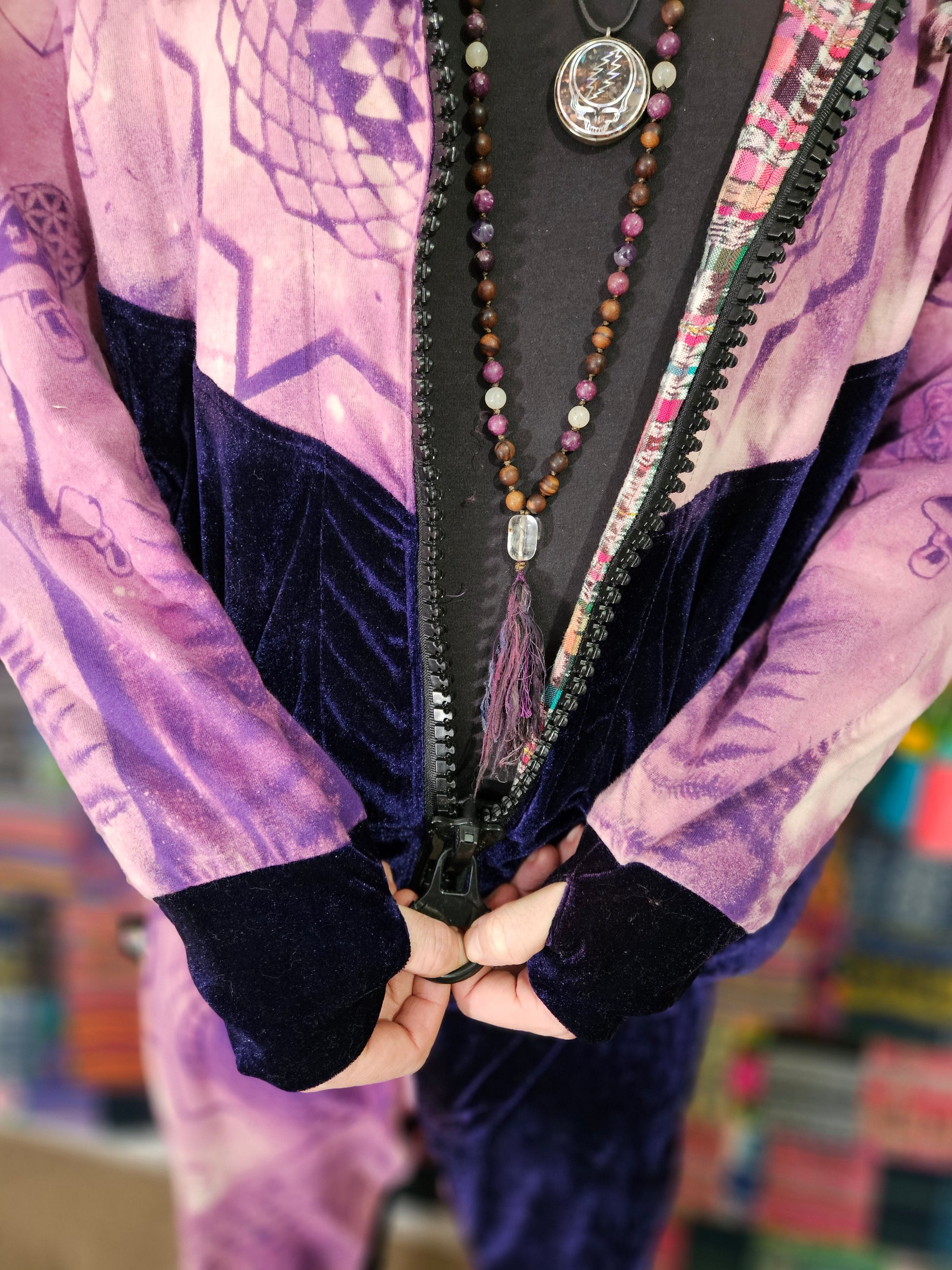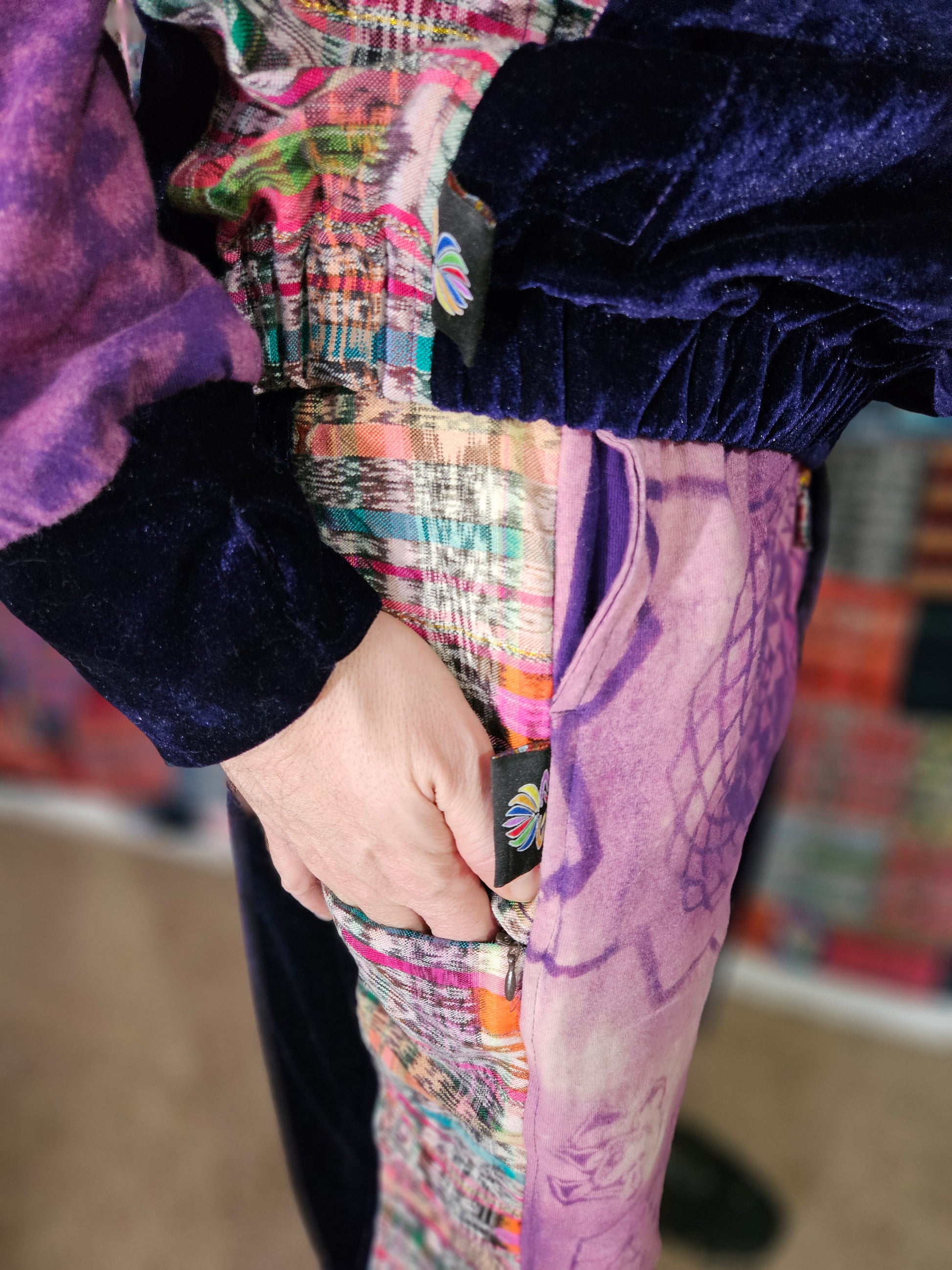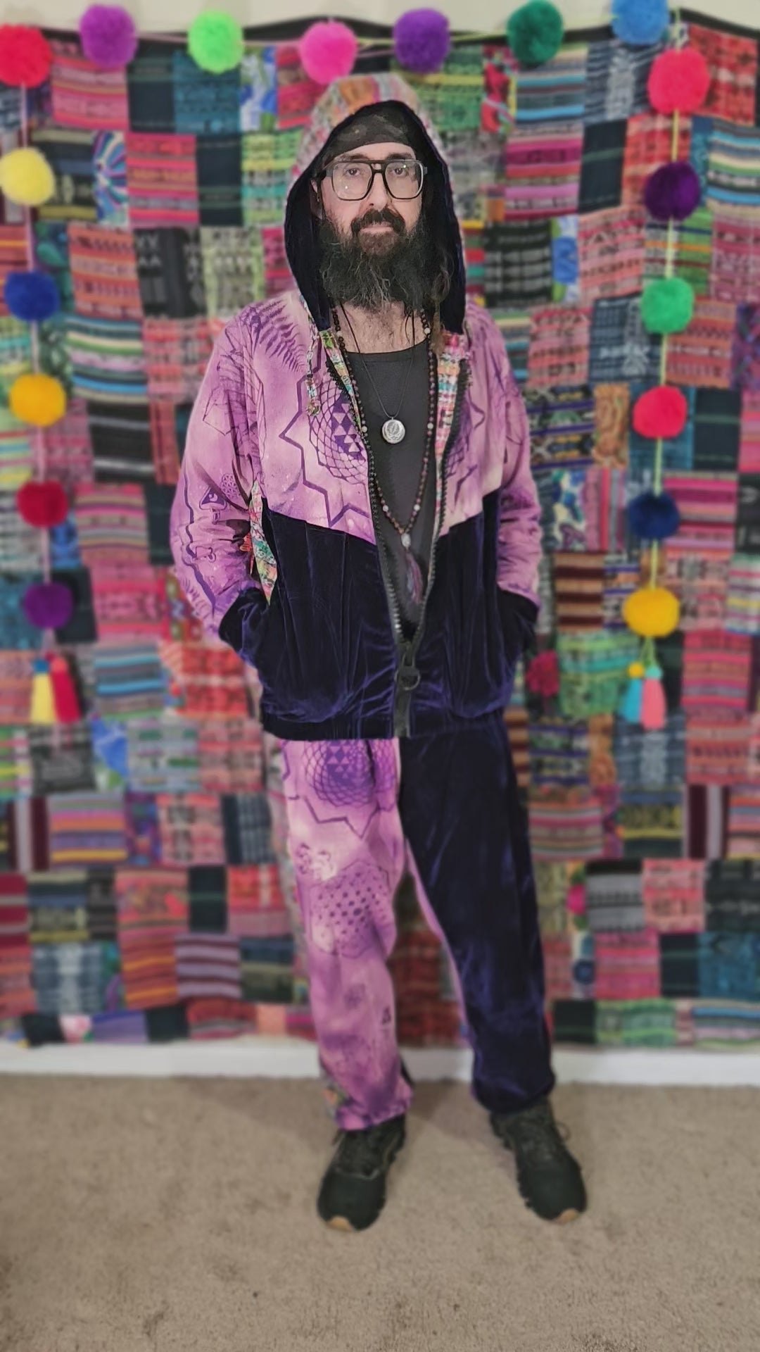 Funk up your vibe & liberate your fashion with this super heady one of a kind collab tracksuit fit by Moksha Moda & Jenzified Designz. The tracksuit is ethically crafted in Guatemala with beautiful upcycled hand woven Mayan fabric for the detail, elegant velvet, and super soft breathable jersey that is then shipped to Jenzified Designs in Maine for her to hand bleach stencil post production. This one of a kind tracksuit fit also features three pockets in the jacket including a velcro pocket in the hood, ridiculously large zipper, thumb holes in the sleeves, and three pockets in the joggers including one zipper pocket.